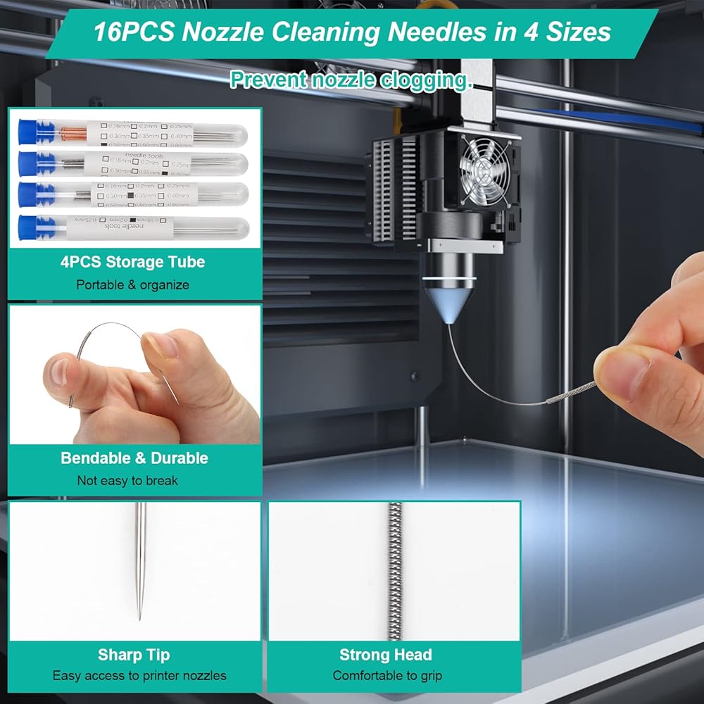 16PCS In 4 Size : 16 Stainless steel nozzle cleaning needles are 4 sizes, 0.2mm, 0.35mm, 0.4mm, 0.5mm. Flexible cleaning pins, easily reach the printer nozzle to avoid clogging. 4 storage tubes to store cleaning needles of different sizes, easy to carry and store