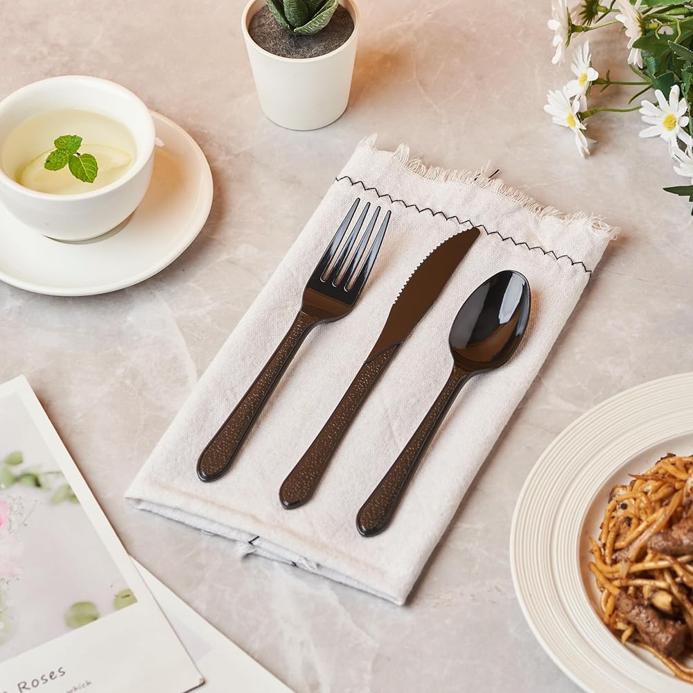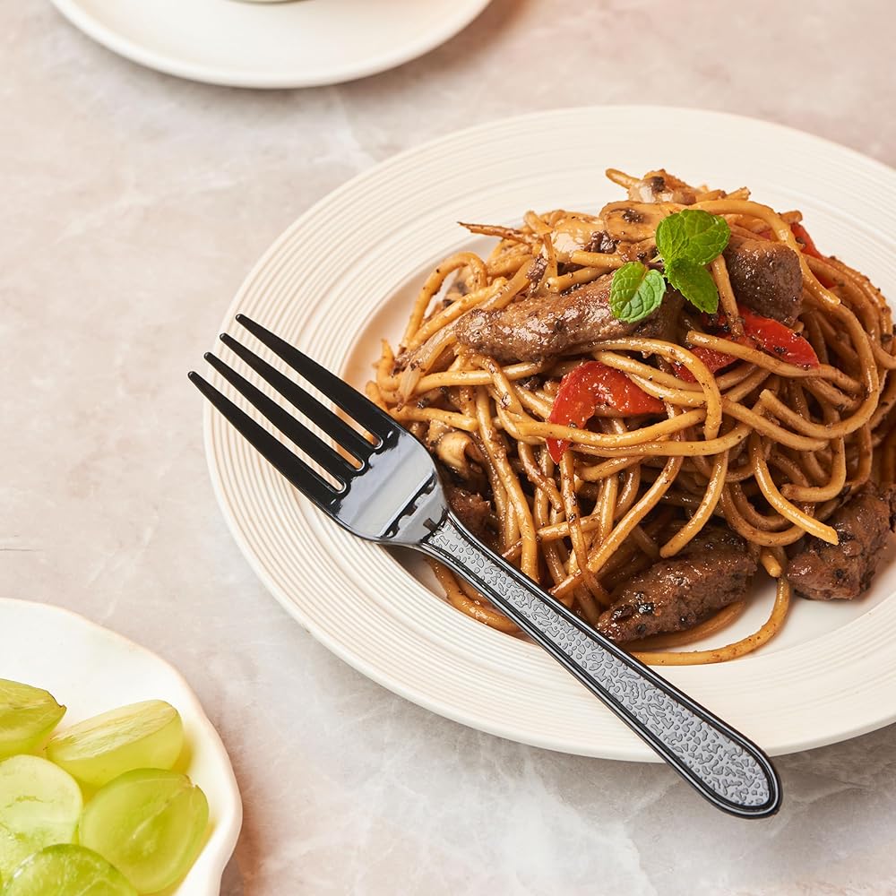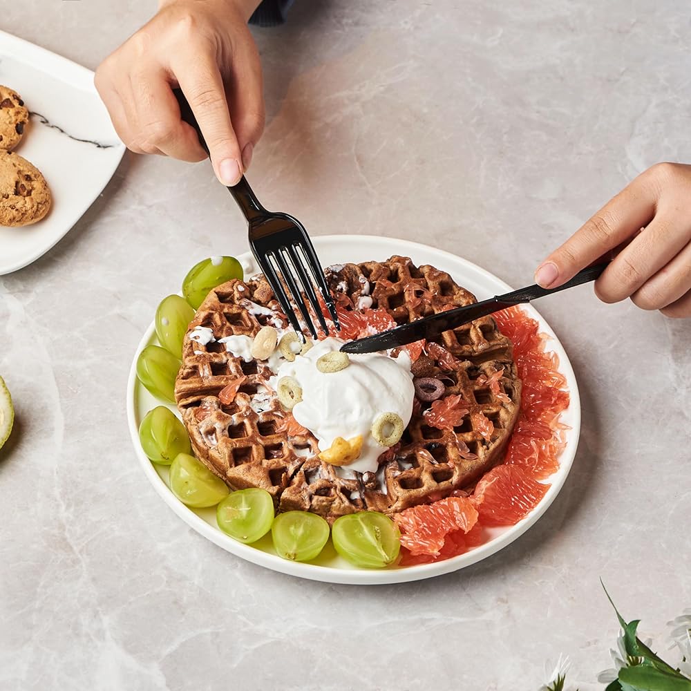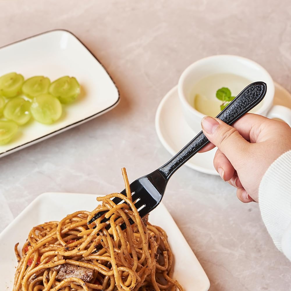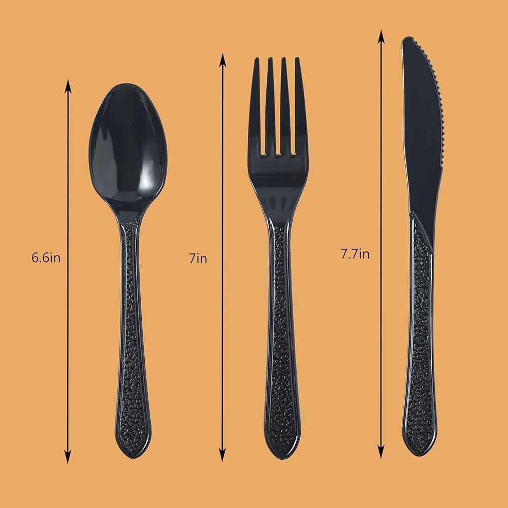• متينة: مصنوعة من البلاستيك عالي التحمل، مجموعة أدوات المائدة هذه قوية بما يكفي لتحمل الأطعمة الساخنة والباردة. تم تصميم كل قطعة من أدوات المائدة لتتحمل طوال الوجبة بأكملها، حتى عندما تتكون قائمتك من أطعمة سميكة وثقيلة مثل السباغيتي مع كرات اللحم أو الحساء أو البطاطس المهروسة المكتنزة.
