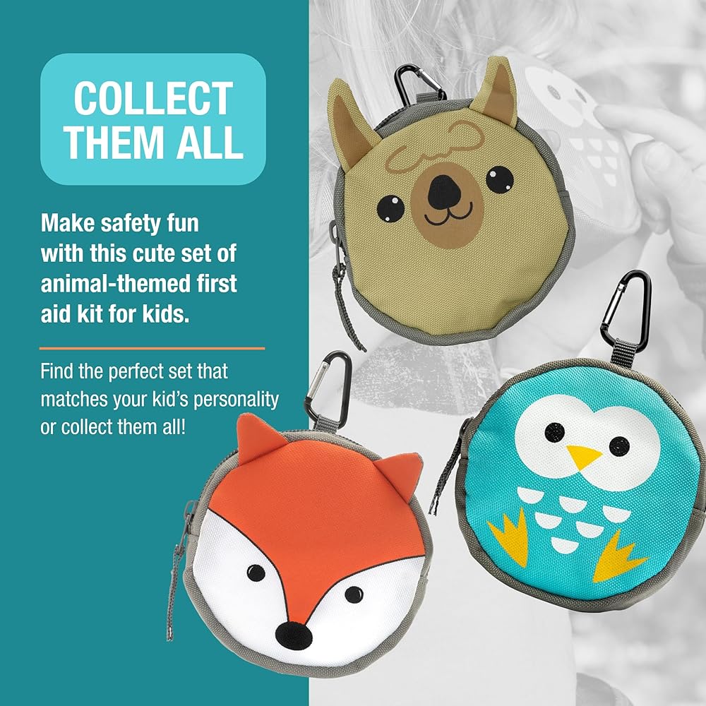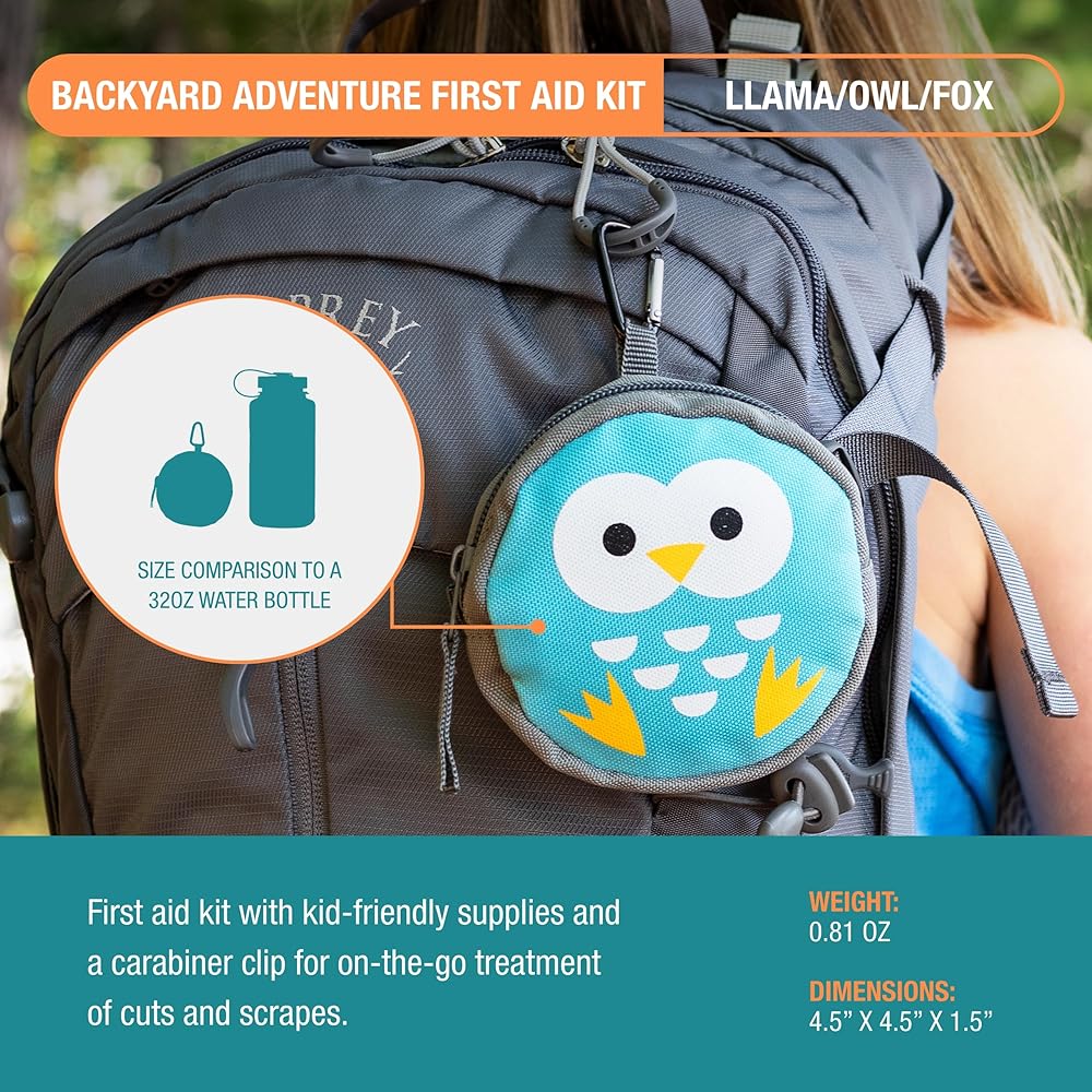 The Backyard Adventure First Aid Kit for kids makes first aid fun and easy! Perfect for outdoor activities, this medical kit includes kid-friendly first aid supplies to treat cuts and scrapes in a cute woodland critter case. The carabiner makes it easy to clip this mini first aid kit to your child's backpack for school field trips, family hikes, summer camp, or backyard adventures. Despite its small size, this owl kit has a little extra room so you can add your child's personal medications or treasures from their adventures.