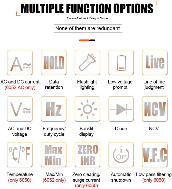 قياس متعدد: يمكن لمقياس المشبك هذا قياس جهد التيار المتردد/تيار مستمر، والجهد المنخفض (التيار المتردد)، وتيار تيار متردد/تيار مستمر، والمقاومة، والسعة، والتردد، ودورة العمل، ودرجة الحرارة، واختبار السلك المباشر، والصمام الثنائي، واختبار الاستمرارية. سواء للصيانة الروتينية أو مهام الهندسة الكهربائية المعقدة، فهو يلبي جميع احتياجاتك.