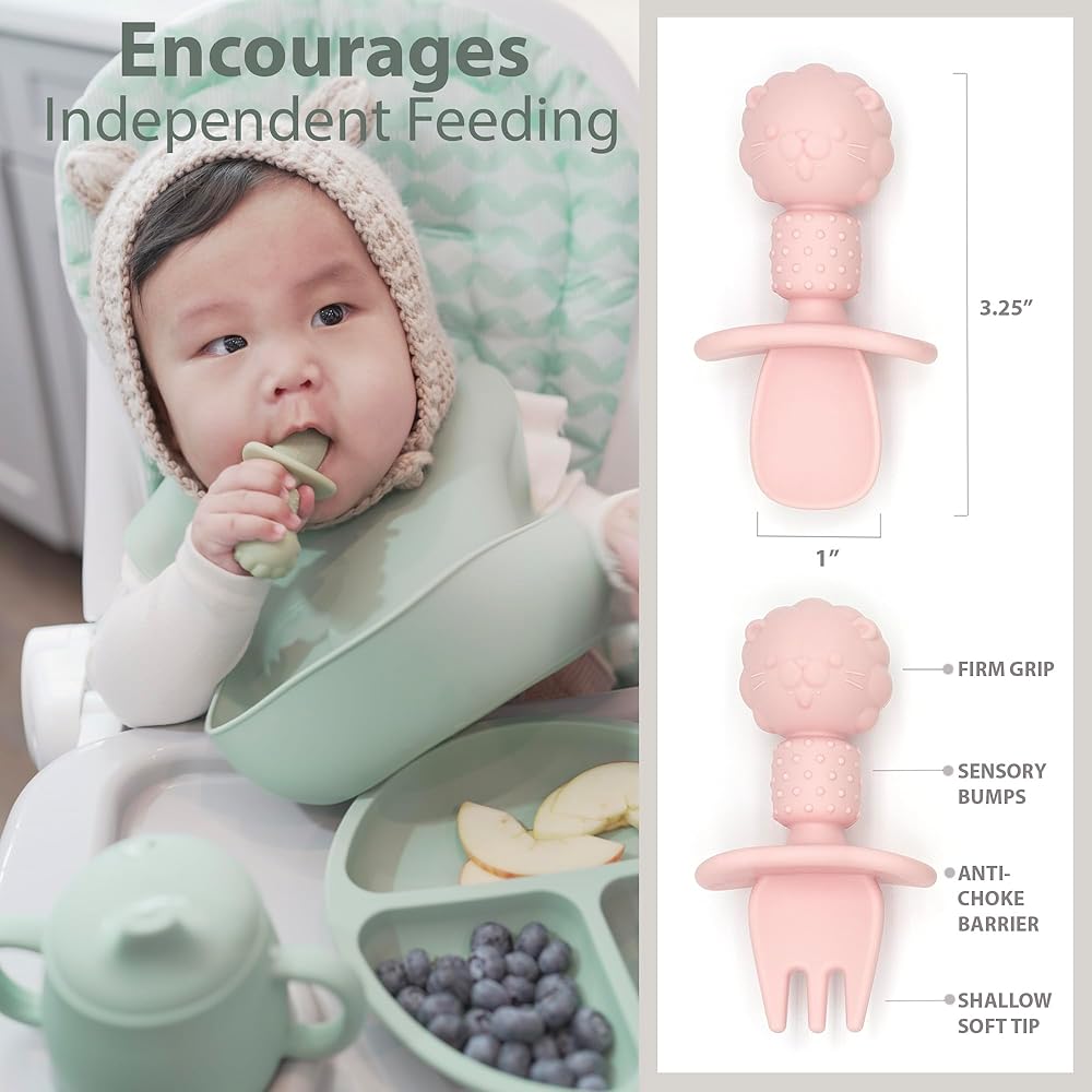 THE PERFECT SPOON & FORK SET - This set will be a game-changer for your little one as they get used to eating solid foods and feeding themselves. This spoon and fork set is perfect for baby led weaning stage 1 - introducing babies to the idea of holding their own utensils. At the beginning of BLW, practice dipping the spoon into purees. For babies 6 months up, it's best to use the fork and spoon to dip and scoop, not to spearing or piercing solid foods.
