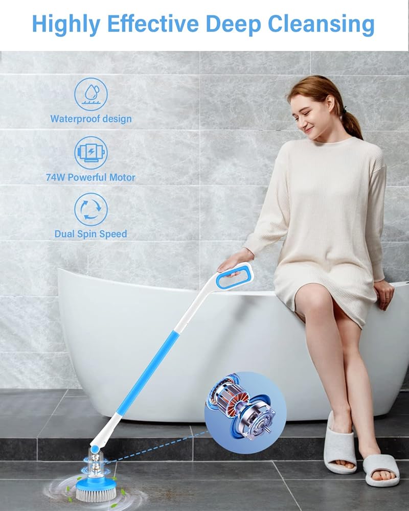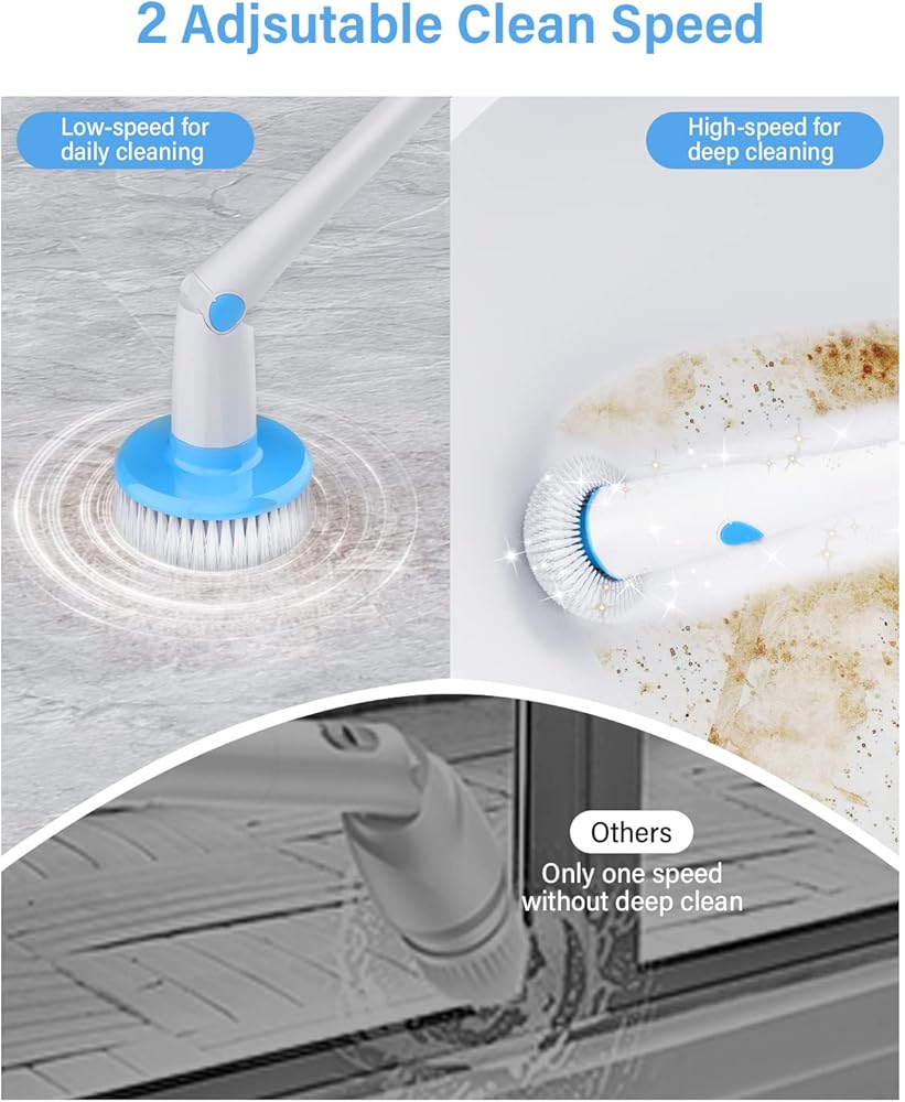 【محرك قوي 74 وات ونموذج سرعتين】قوة جهاز التنظيف الكهربائي 74 وات، وهي أقوى من 7 وات إلى 24 وات الأخرى. محرك قوي يدفع رأس الفرشاة للدوران بسرعة منخفضة عند 250 دورة في الدقيقة وسرعة عالية عند 300 دورة في الدقيقة لتلبية متطلبات التنظيف المختلفة. لإزالة البقع العنيدة، يرجى استخدام منظف الاستحمام مع المنظفات.