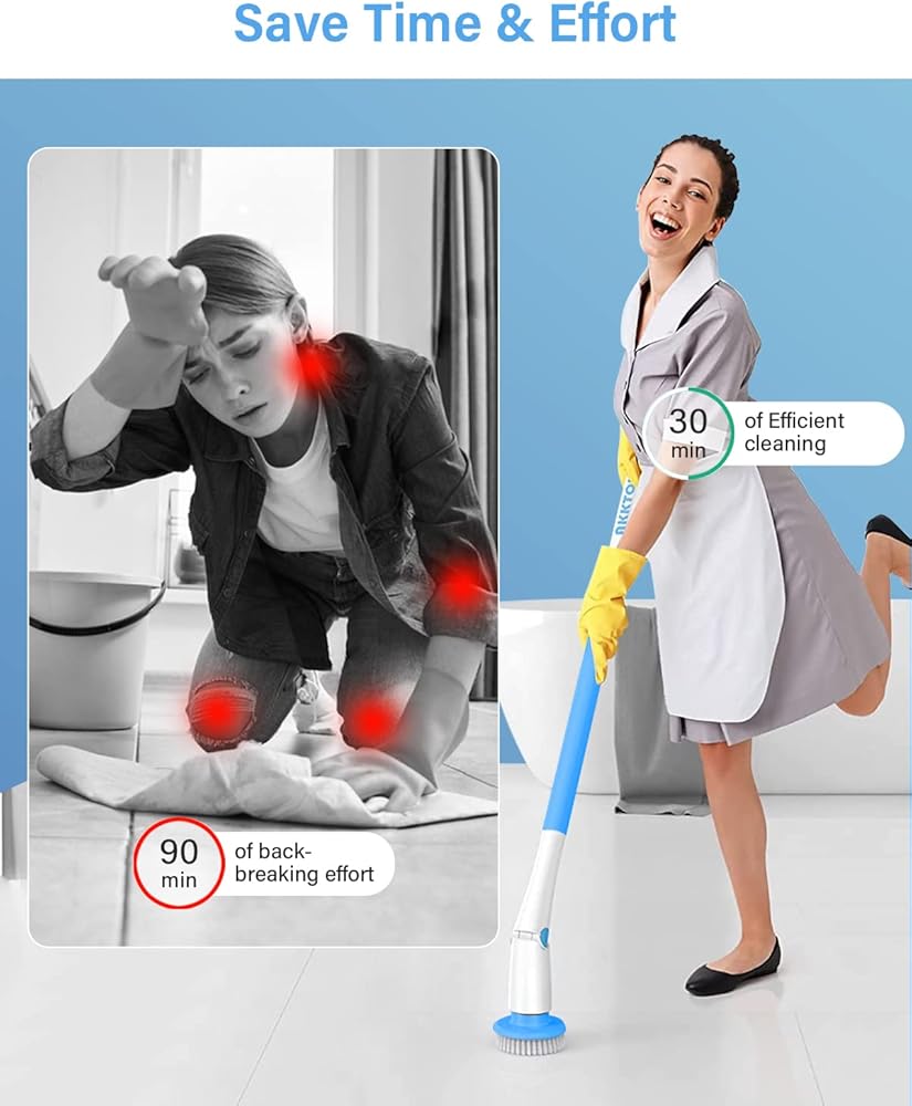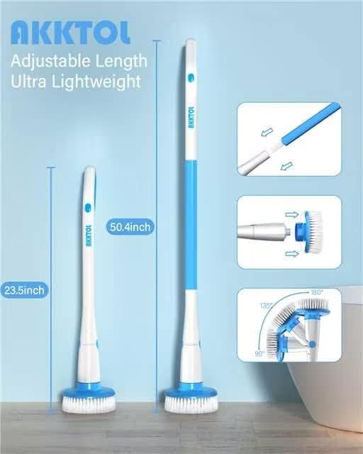 منظف دوار كهربائي من AKKTOL، منظف دش بمقبض طويل، منظف كهربائي مع 6 فرشاة قابلة للاستبدال، مقاومة للماء 1.5 ساعة IPX7، رؤوس تصل إلى 300 دورة في الدقيقة، منظف كهربائي لتنظيف الحمام والحوض والأرضية