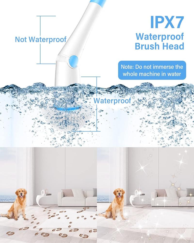 【تنظيف آمن】بينما لا ينبغي غمر جهاز التنظيف الدوار بالكامل في الماء، فإنه يقاوم الرذاذ. يوصى بإزالة رأس الفرشاة بشكل منفصل للتنظيف. للحصول على تأثير تنظيف أفضل، يرجى رش المنظف على البقع قبل التنظيف بالفرشاة الكهربائية. (يرجى عدم غمر الجهاز بالكامل في الماء).