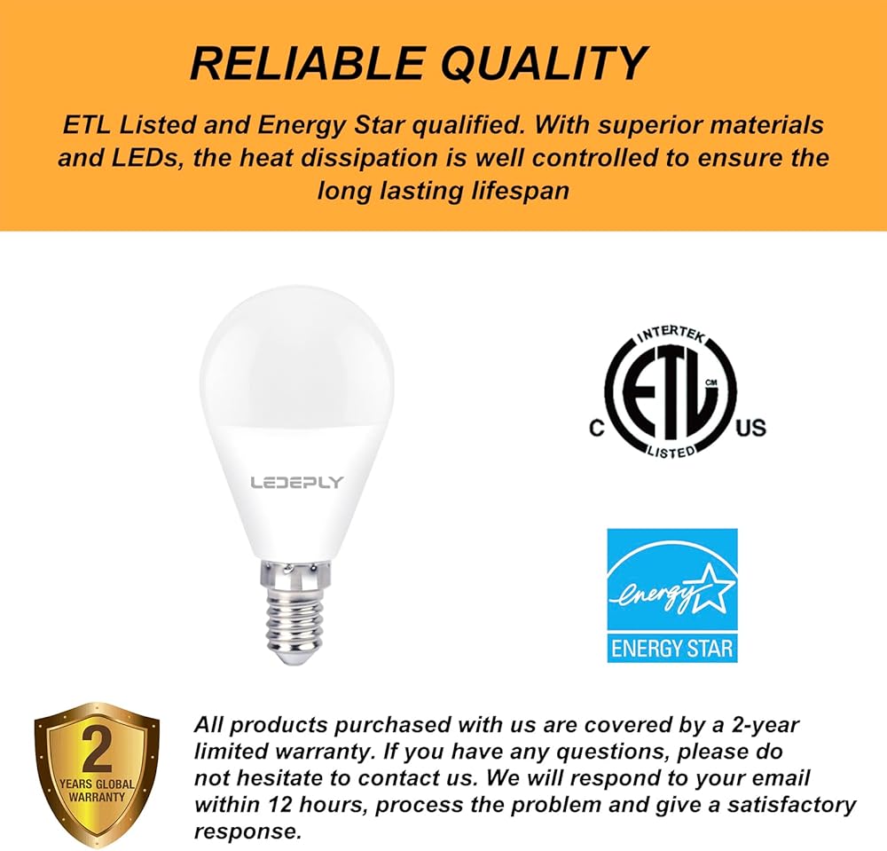 ※معتمد من ETL وضمان لمدة عامين ※ تم تصنيع مصابيح A15 LED القابلة للتعتيم من مواد ودوائر فاخرة، وفقًا لمعايير السلامة الصارمة لـ ETL. عمر خدمة طويل (حوالي 25,000 ساعة)، لا حاجة لتغيير المصابيح بشكل متكرر، مع ضمان خاص لمدة عامين.