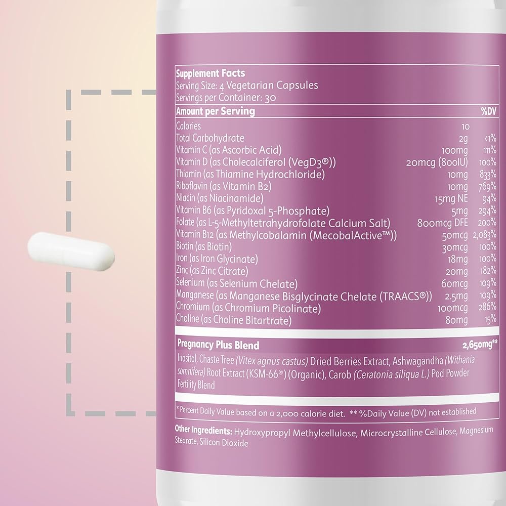 مكمل الخصوبة للنساء مع فيتامينات ما قبل الولادة - حمض الفوليك والحديد وفيتامين C وD وB6 وB12 والزنك والسيلينيوم والأشواغاندا لدعم الإباضة الصحية والحمل والحمل، 120 كبسولة