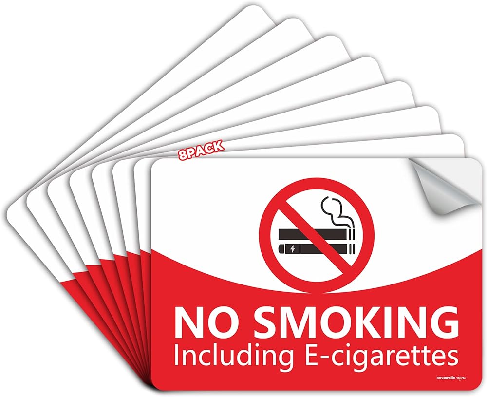 ✅PERFECT SIZE: 8 PACK No Smoking No Vaping Sign Stickers, Size: 10 inches width x 7 inches height. Clean lines and Black & Silvery background maximizing visibility in any surface.