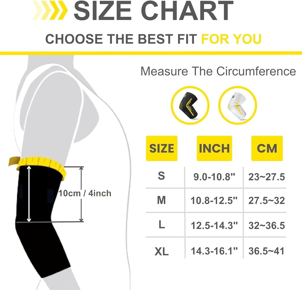 مقاسات عالمية - يمكن أن تناسب مجموعة واسعة من مقاسات الكوع العلوي؛ ما عليك سوى قياس محيط 5 سم أو 2 بوصة فوق مفصل الكوع بذراعك واختيار أي منهما، يرجى الرجوع إلى جدول المقاسات الخاص بنا.