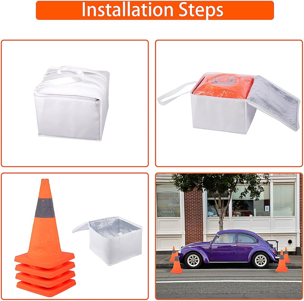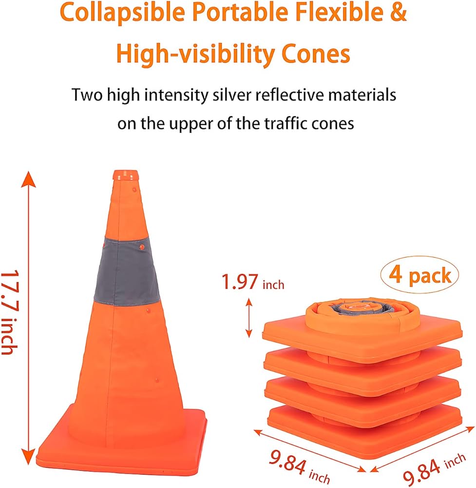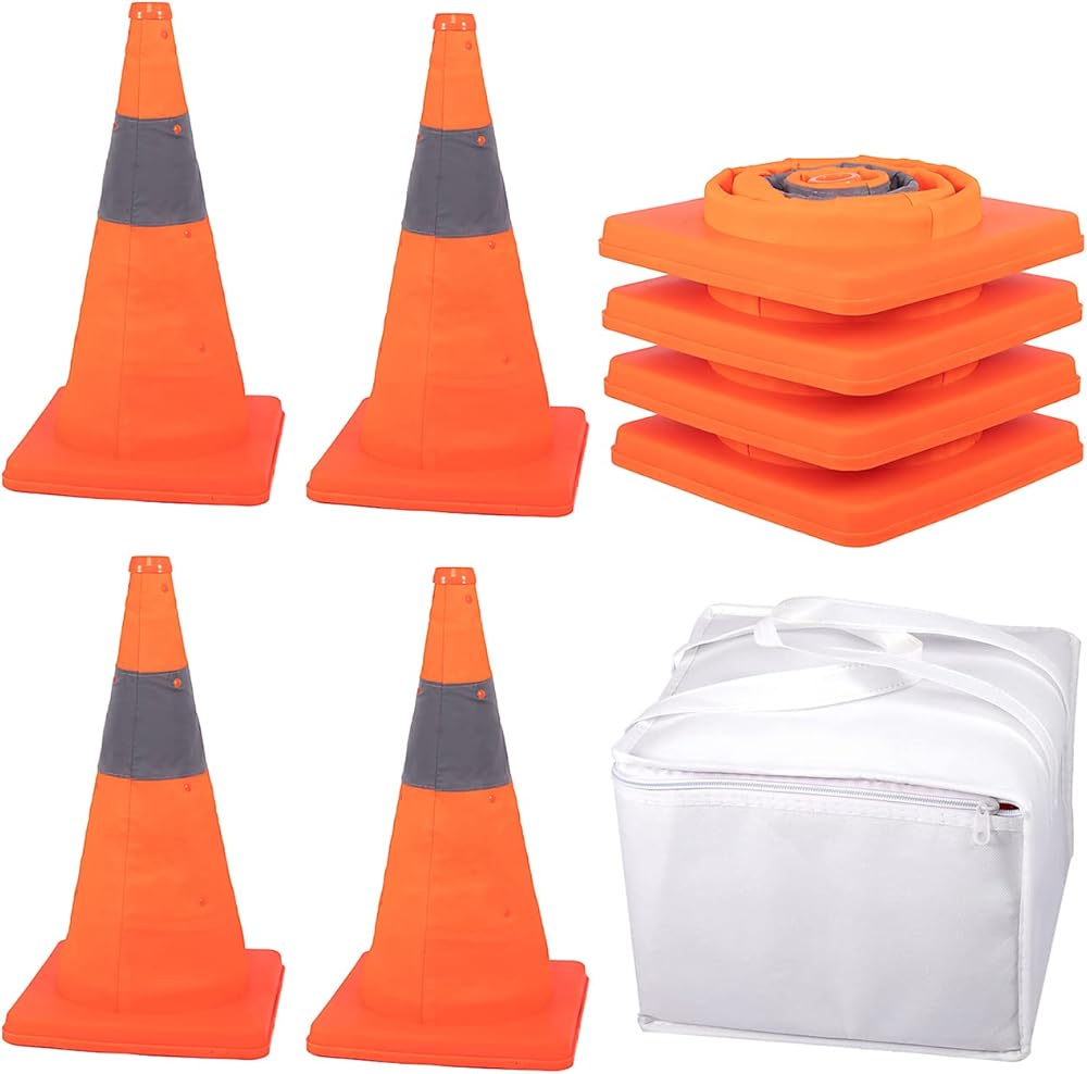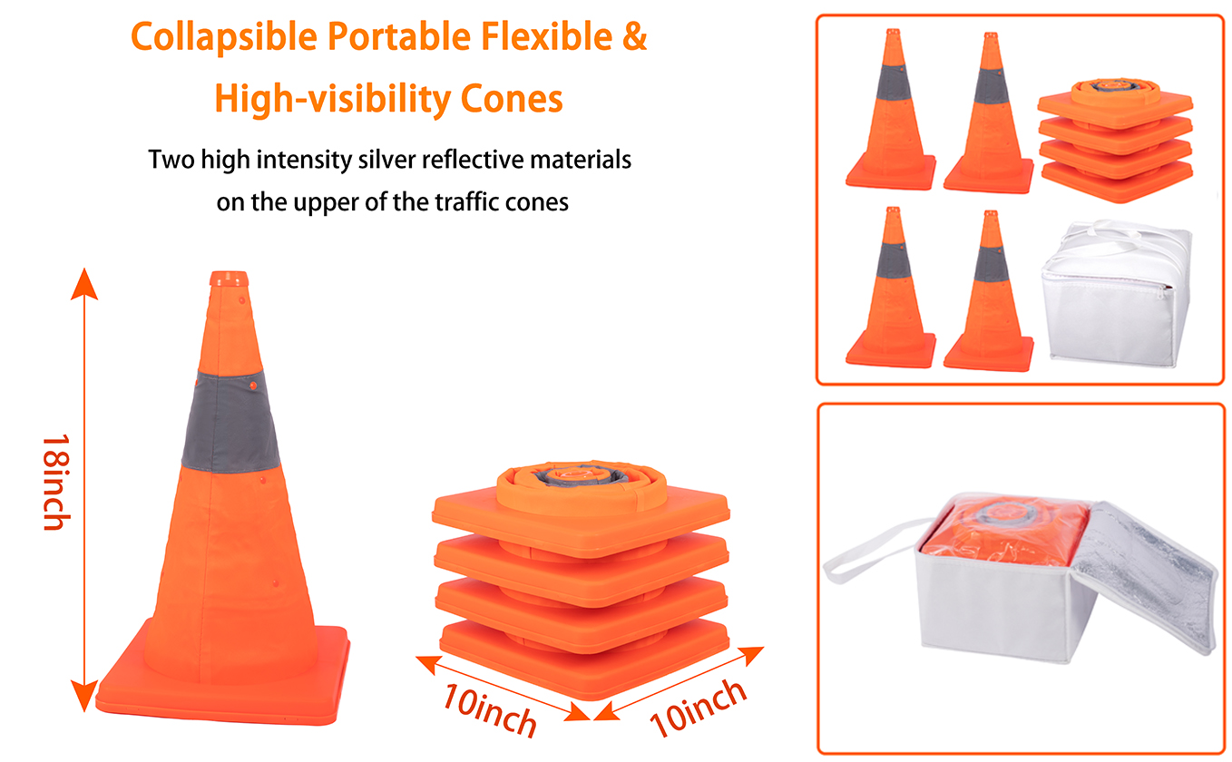 • سهلة الحمل مع حقيبة تخزين - تحتوي هذه المجموعة على أربعة مخاريط مرورية قابلة للطي تأتي مع حقيبة تخزين لسهولة الحمل والتخزين. سواء كنت بحاجة إلى استخدامها في مناسبة سريعة أو تخزينها في صندوق سيارتك لحالات الطوارئ، فهذه المجموعة مثالية لأي شخص يحتاج إلى الاستعداد أثناء التنقل