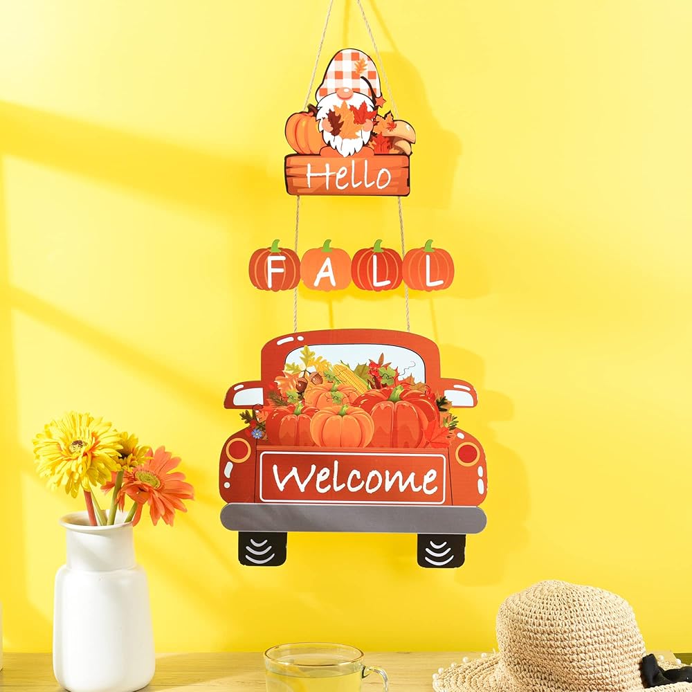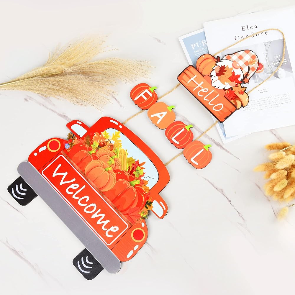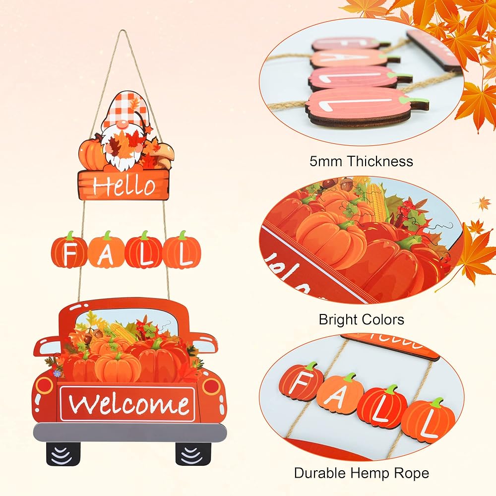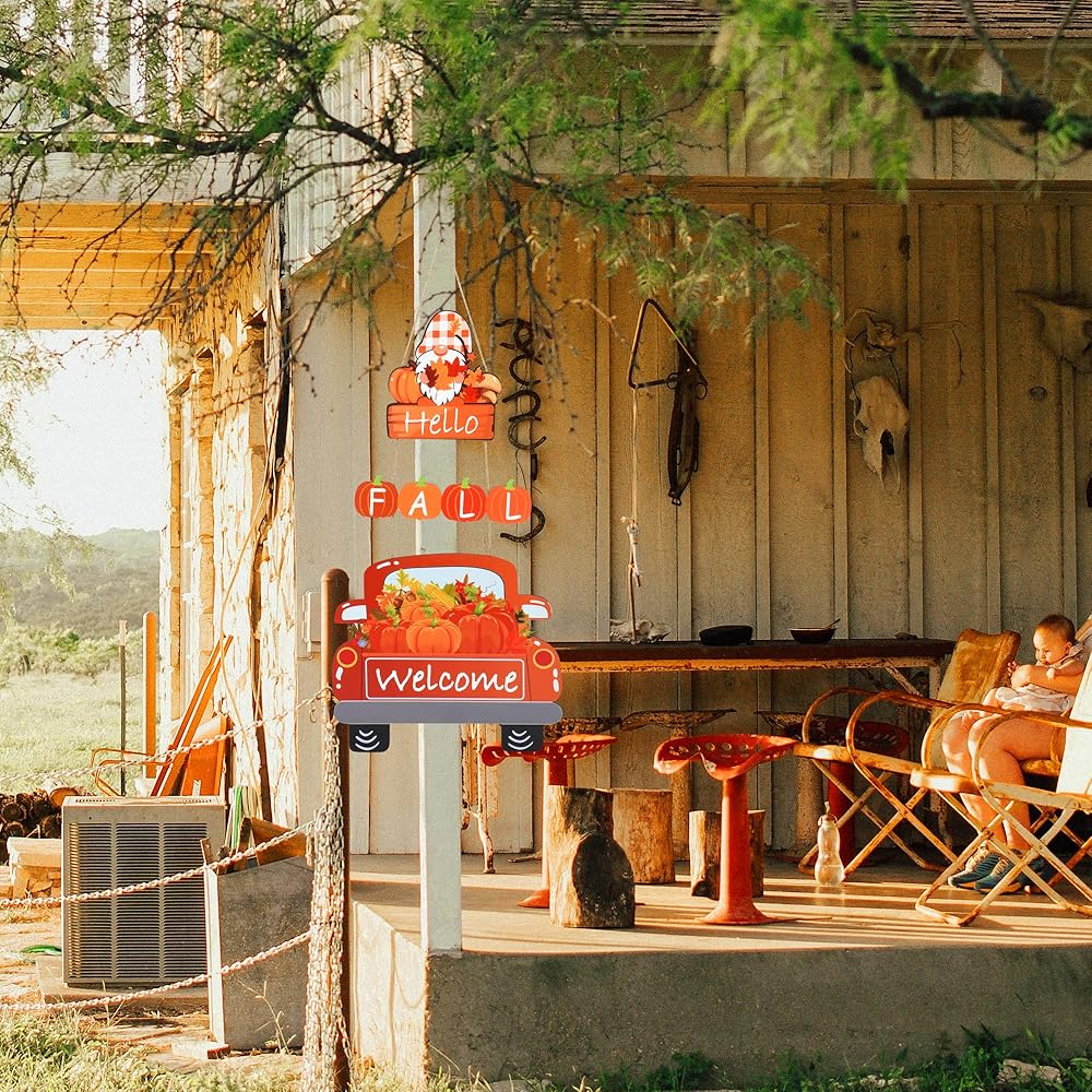 Charming Appearance: this farmhouse autumn ornaments uses rich elements of maple leaf,pumpkins,corn and etc; The first part is a plaid gnome [hello] sign, the second part is pumpkin [fall] sign, and the third part is a large farmhouse pumpkin truck, with a plate called [welcome]