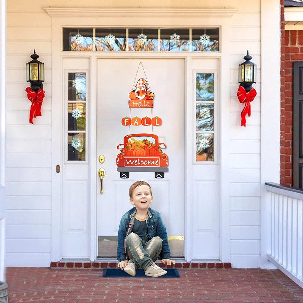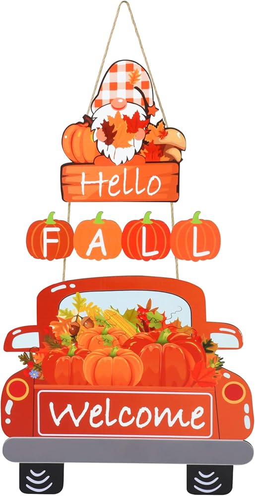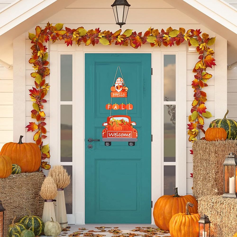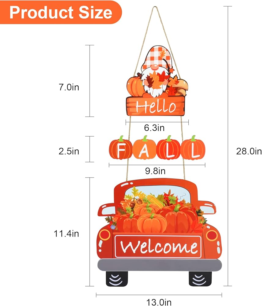 Charming Appearance: this farmhouse autumn ornaments uses rich elements of maple leaf,pumpkins,corn and etc; The first part is a plaid gnome [hello] sign, the second part is pumpkin [fall] sign, and the third part is a large farmhouse pumpkin truck, with a plate called [welcome]