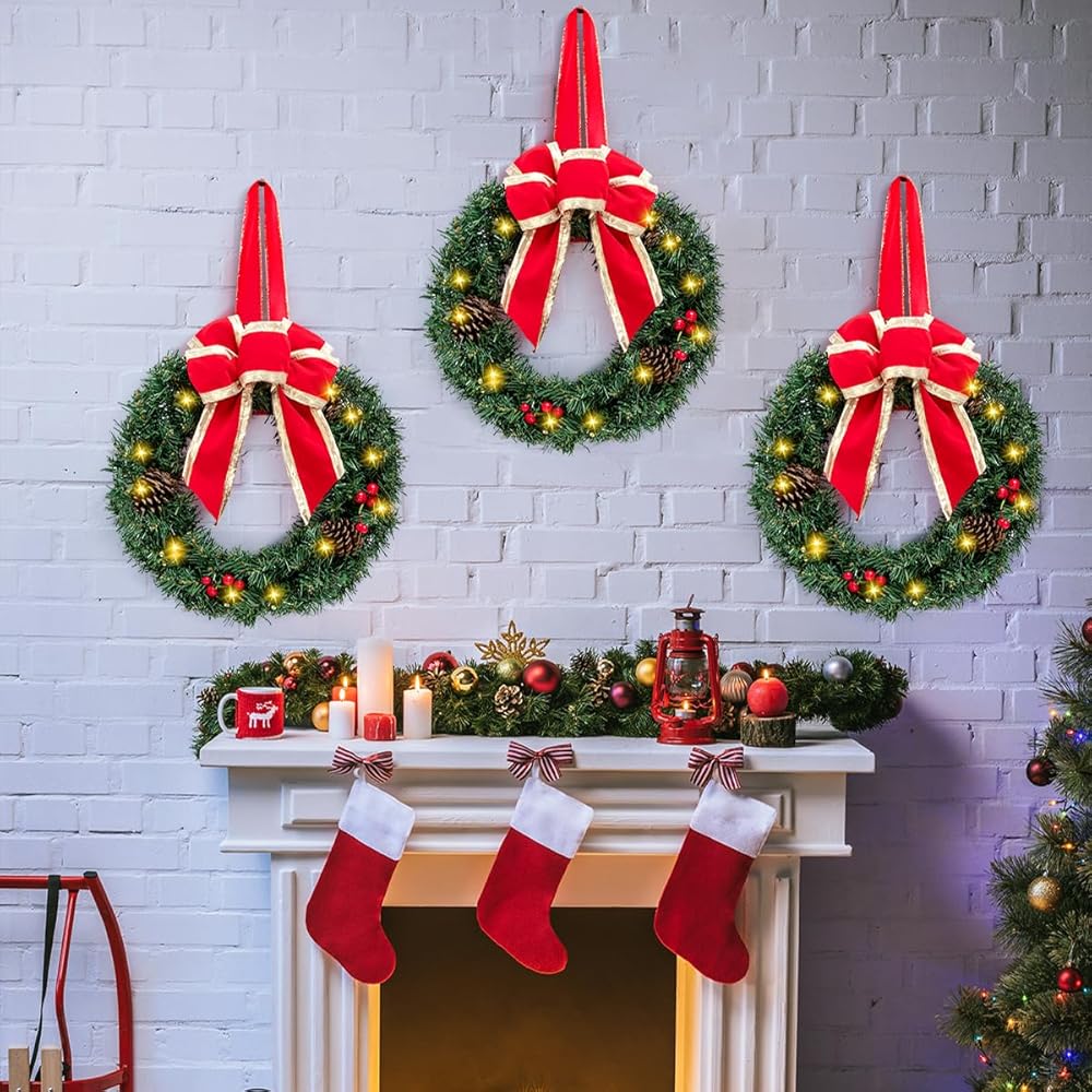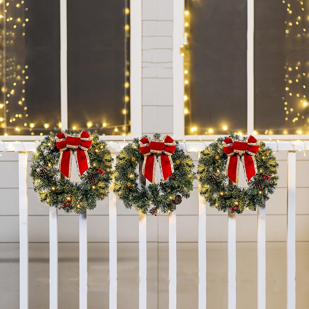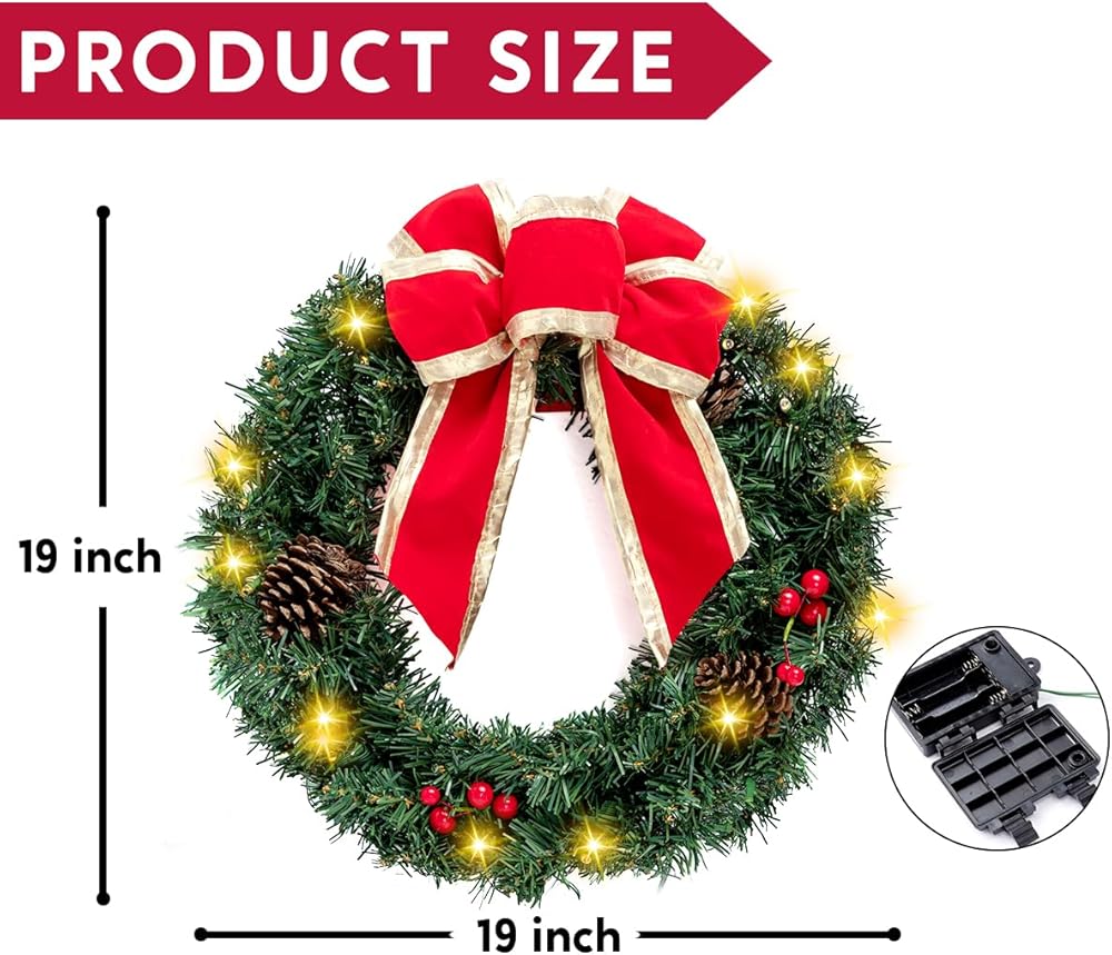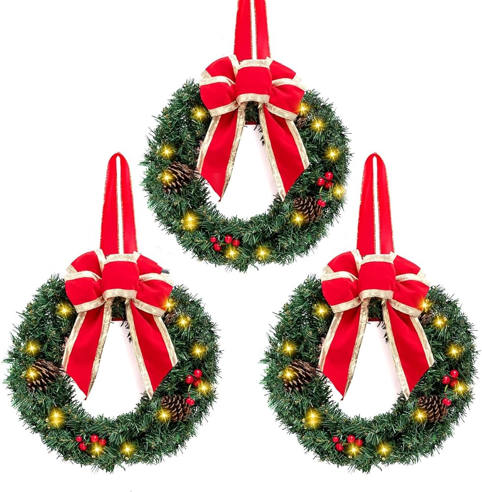 JOIEDOMI 3 عبوات 19 بوصة من أكاليل عيد الميلاد الصناعية المضاءة مسبقًا مع مخاريط الصنوبر والتوت والفروع المتجمدة و20 مصباحًا دافئًا لجدار الباب الأمامي للمنزل وزينة عيد الميلاد
