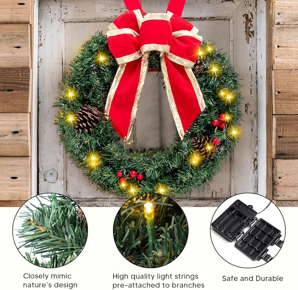 أضف البهجة على منزلك واخلق جوًا رائعًا لعيد الميلاد مع أكاليل التوت الخضراء الجذابة هذه مع أكواز الصنوبر والتوت والفروع المتجمدة و20 مصباحًا دافئًا! إكليل رائع للباب الأمامي لعيد الميلاد لفصل الشتاء الاحتفالي في منزلك.
