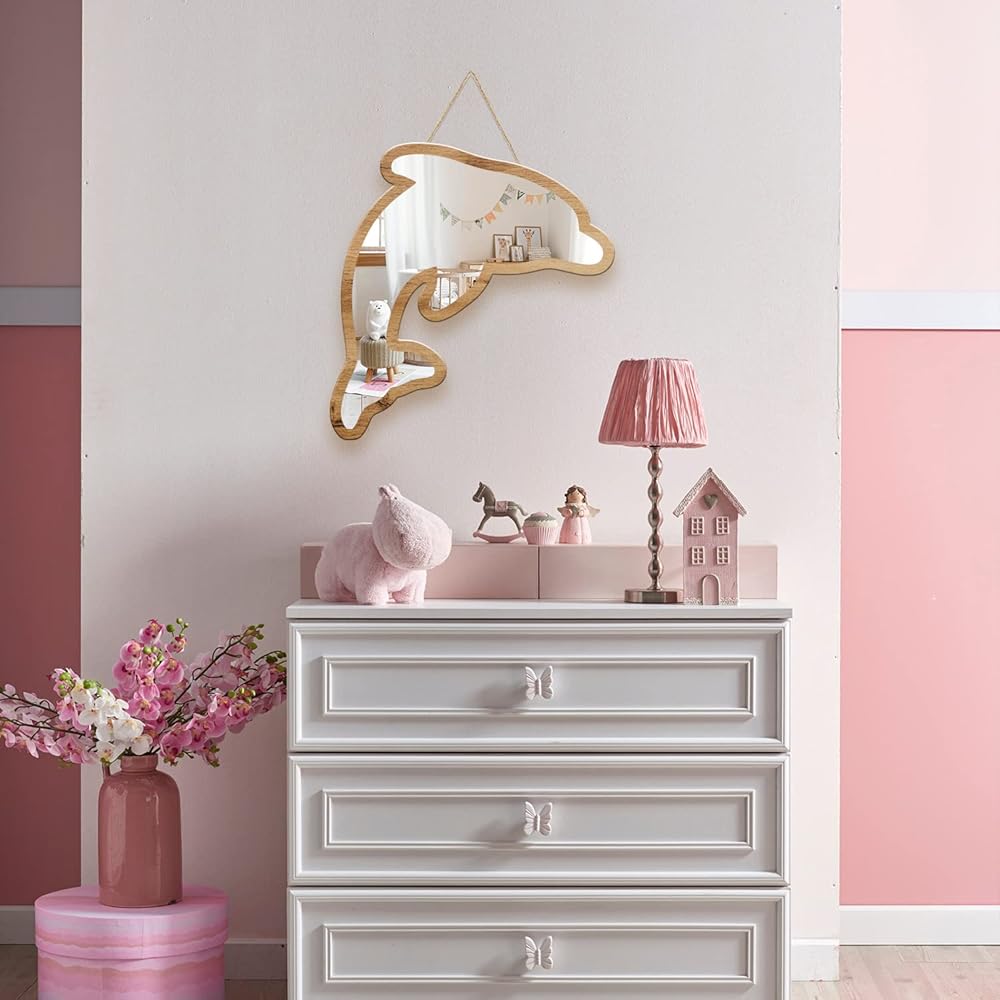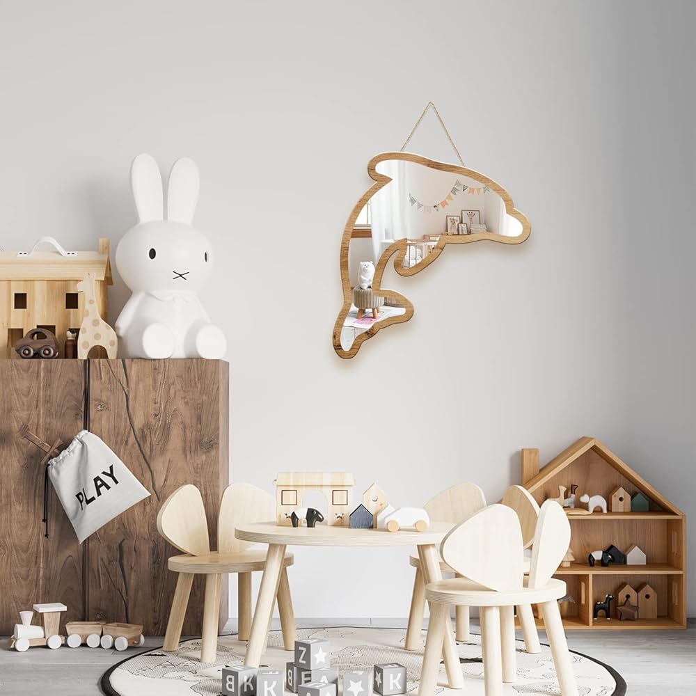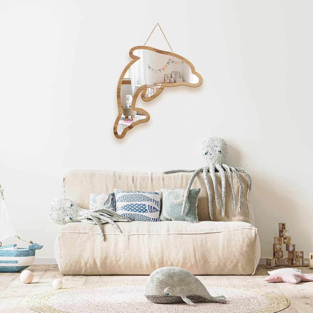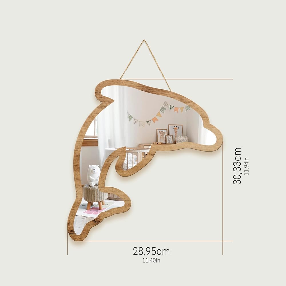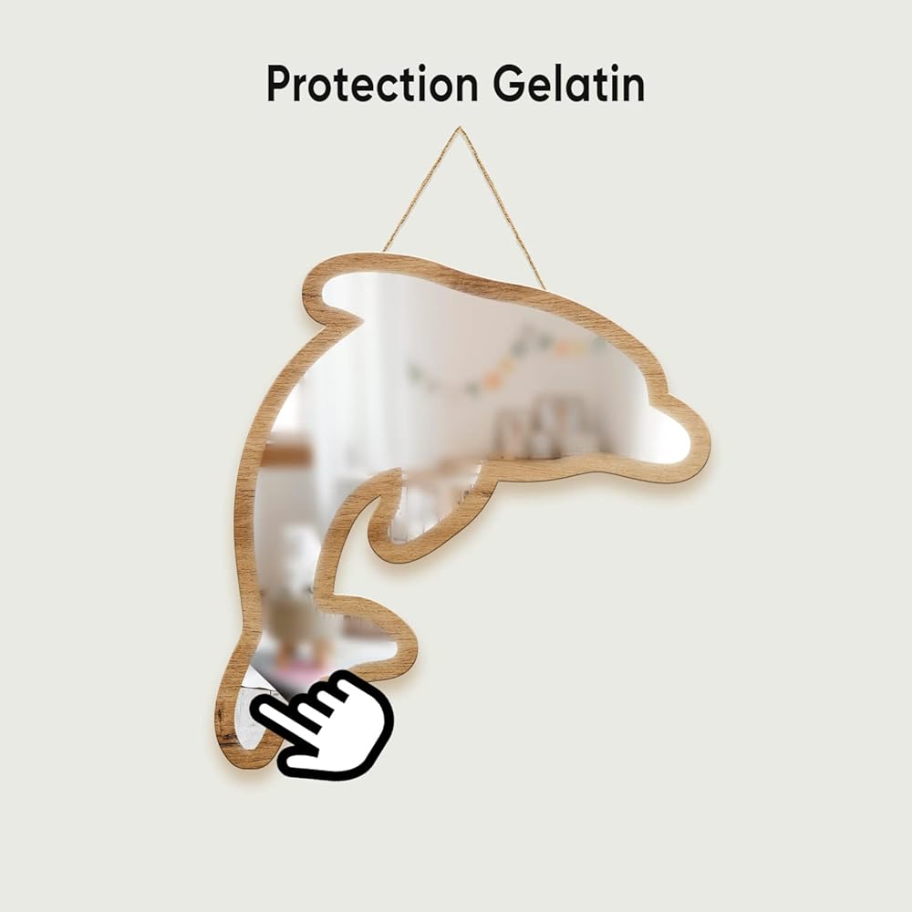 مرآة الحائط الأكريليك هذه بإطار خاص مصنوعة من خشب الزان الطبيعي وتتميز بتصميم دولفين مخرم تم تصميمها خصيصًا لتكون صديقة للبيئة بسبب استخدام الخشب الطبيعي القابل لإعادة التدوير، وهو أيضًا مادة متينة.