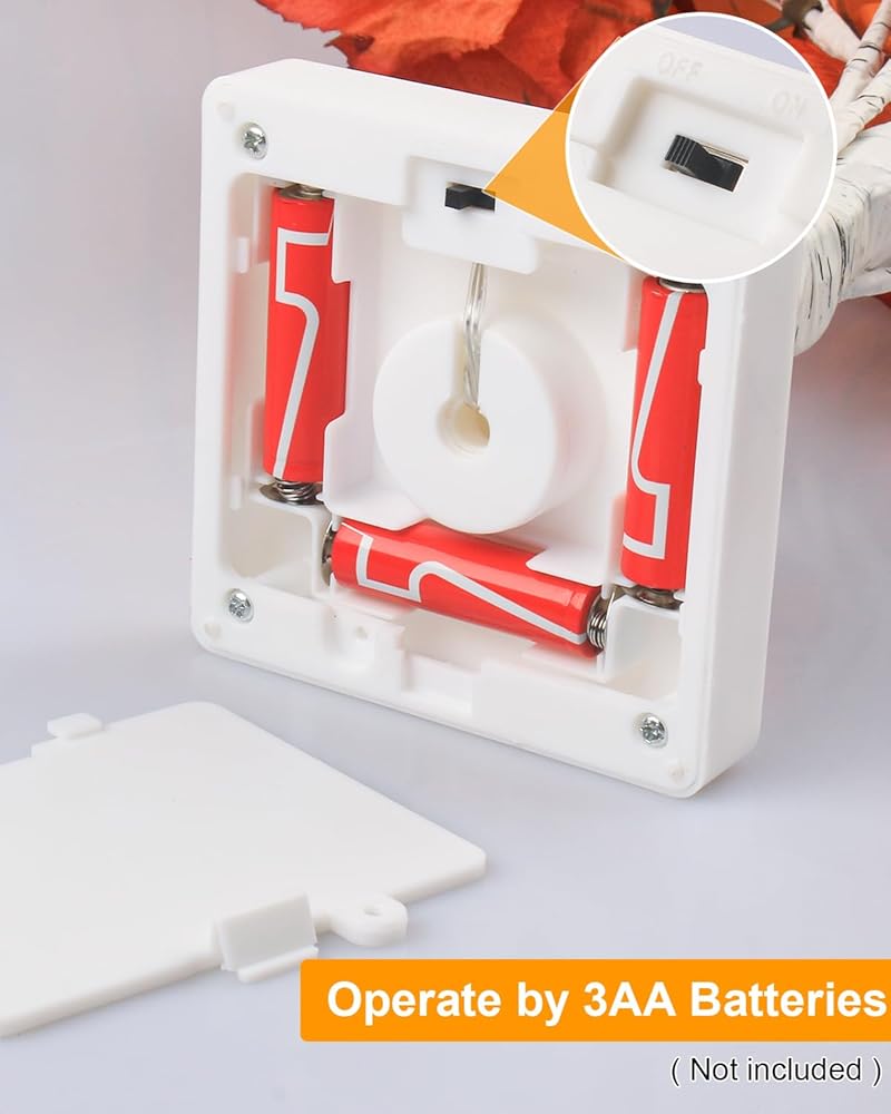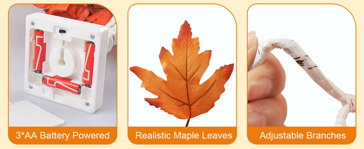 طاقة البطارية وسلامتها: زخارف الخريف مصنوعة من البلاستيك الفاخر ومصابيح ذات جهد منخفض، لذلك لن ترتفع درجة حرارتها عند الاستخدام لفترة طويلة. شجرة وامضة تعمل بـ 3 بطاريات AA (غير متضمنة)، لذلك لا يوجد حد للمكان الذي يمكن استخدامها فيه.
