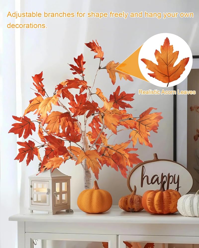شجرة الخريف المضيئة: شجرة الخريف المضيئة مقاس 22 بوصة مزينة بـ 24 مصباح LED أبيض دافئ، وأوراق القيقب الواقعية الملونة. القاعدة المربعة تجعل شجرة الخريف أكثر استقرارًا والفروع البيضاء تجعل مصباح الشجرة أكثر تميزًا.