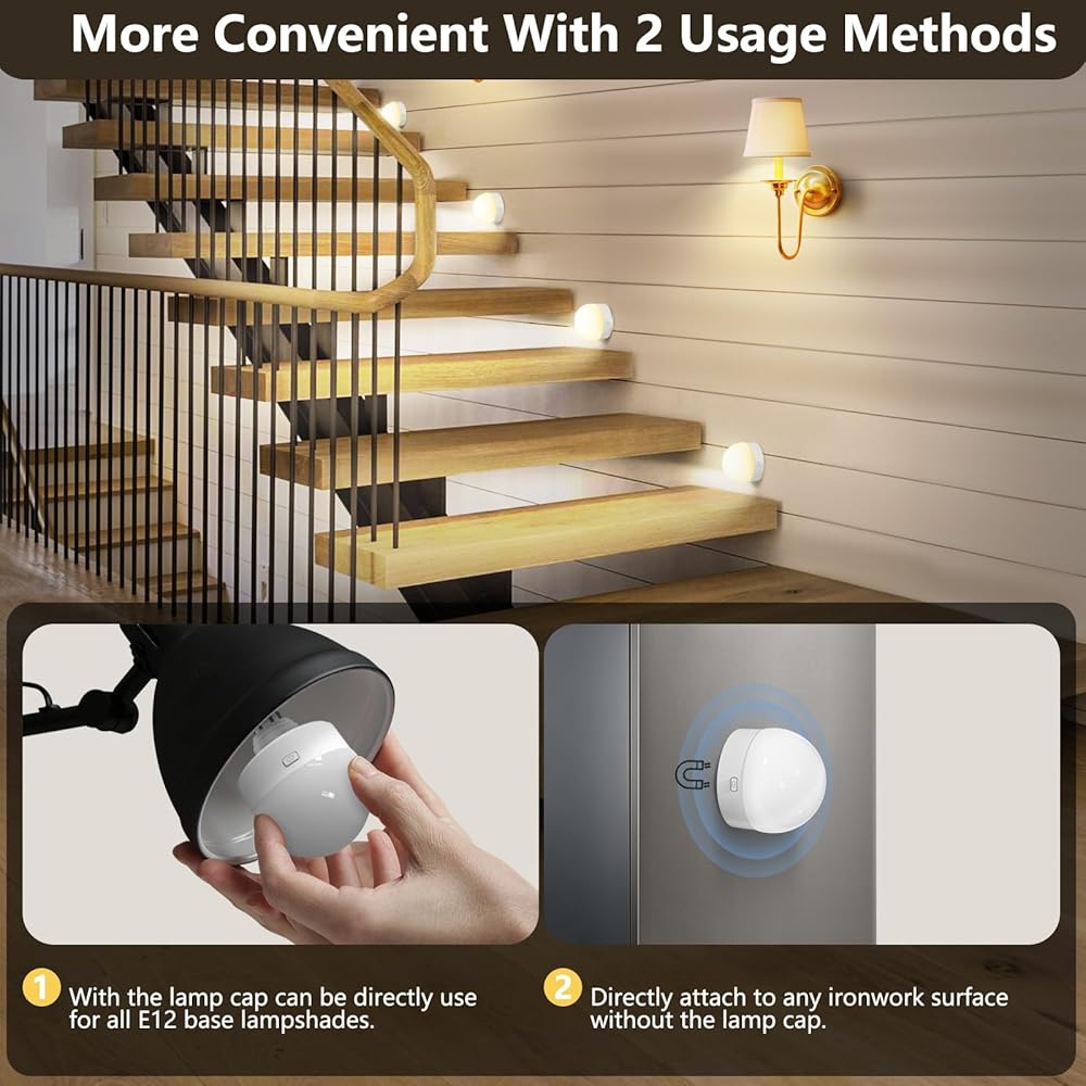 طريقتان للاستخدام: تحتوي لمبة الإضاءة القابلة لإعادة الشحن هذه على طريقتين للاستخدام. مع غطاء المصباح، يمكن استخدام لمبة LED مباشرة لجميع أغطية المصابيح الأساسية E12، أو يمكنك أيضًا ربطها مباشرة بأي سطح حديدي بدون غطاء المصباح. إنه أكثر ملاءمة مع طريقتين للاستخدام.