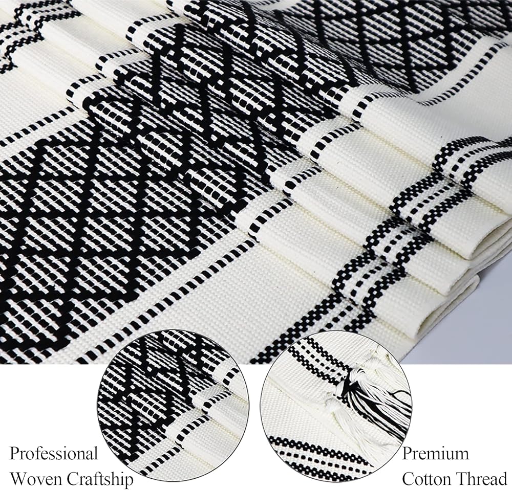 منسوج وعقد احترافي: يتم تحقيق التصميم المذهل لمفارش الطاولة باللونين الأبيض والأسود من خلال النمط الهندسي المنسوج بشكل مثالي والشرابات المعقودة يدويًا. إنه حيث يلتقي الهيبي بالانتقائية، ولكن مع لمسة تقليدية ويضيف لمسة من سحر البوهيمي إلى طعامك منطقة.