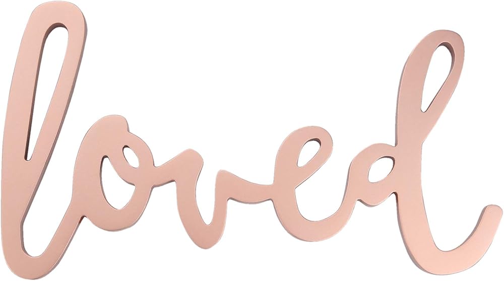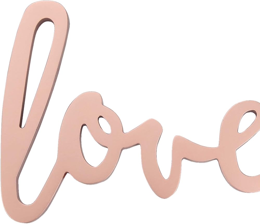 This wood carved wall décor is in a lovely script style and painted in a metallic rose gold. It is 12” wide and 6¾” in height. There are small holes on each end on the back for easy hanging.