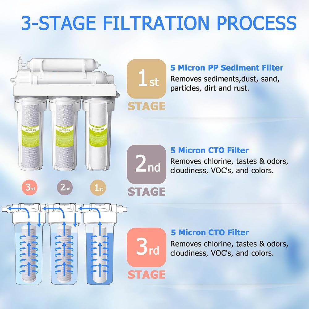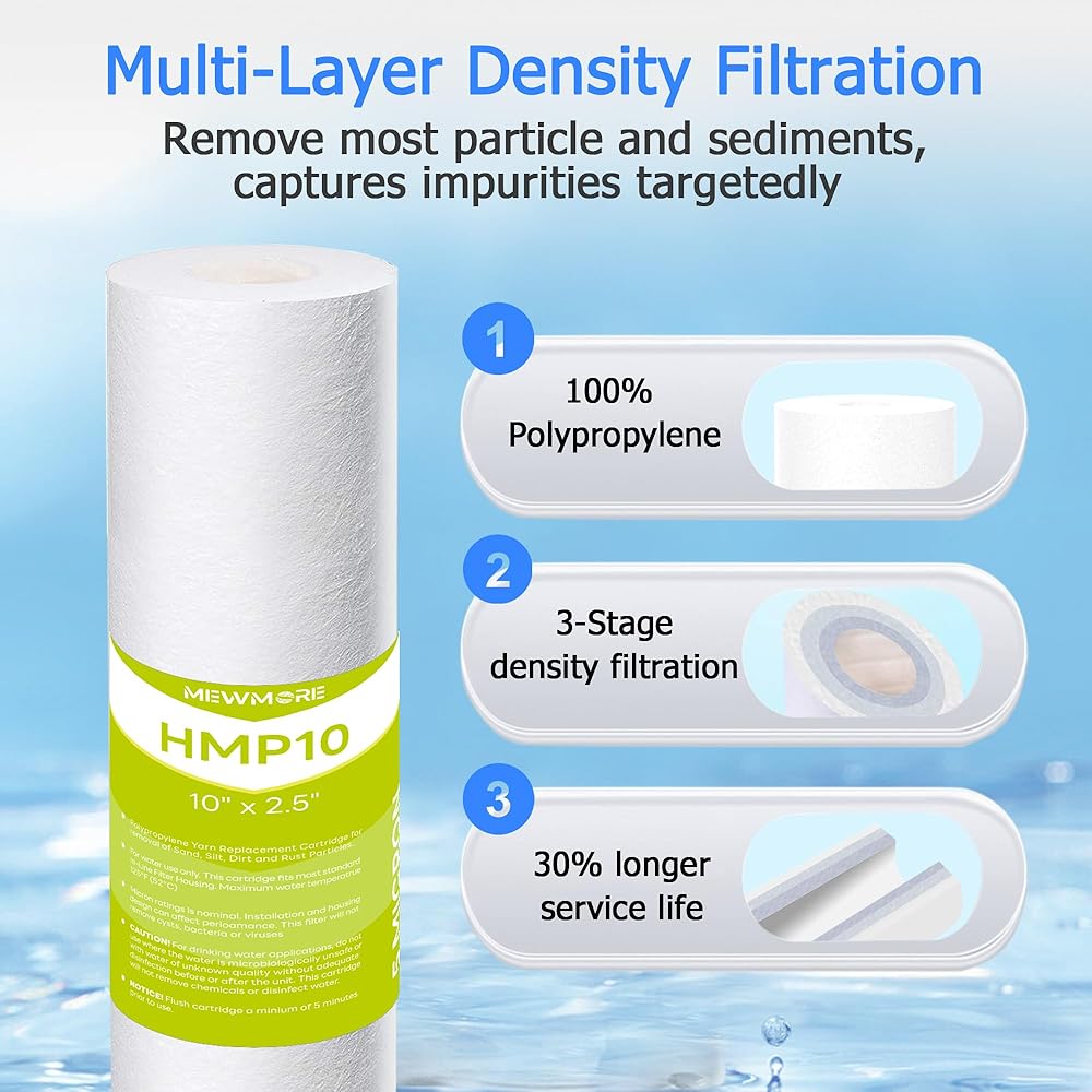 • Melt Blown Sediment Filters: Feature density three PP layers to remove more particle and sediments than other sediment filter of the same size. This design ensures superior filtration efficiency and extends the lifespan of the filter. Effectively remove large particles such as sand, silt, dirt, rust, and debris from water, leading to a noticeable improvement in water clarity.