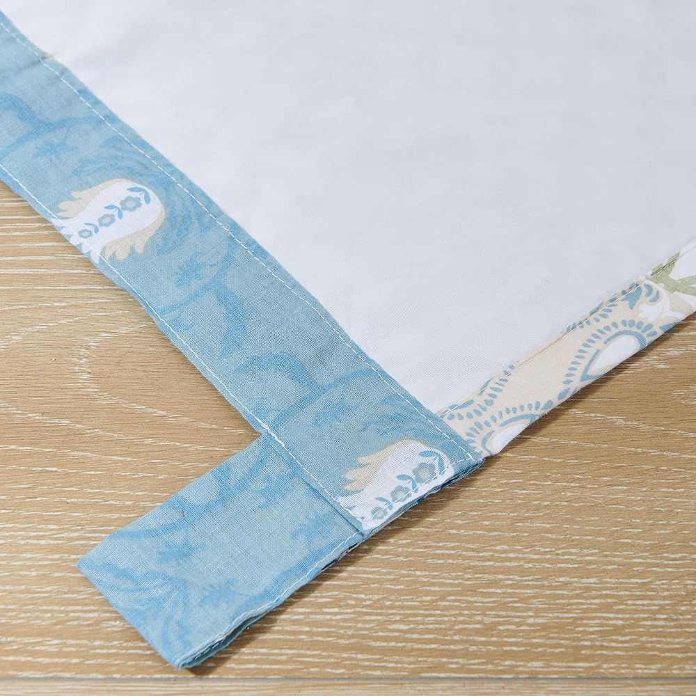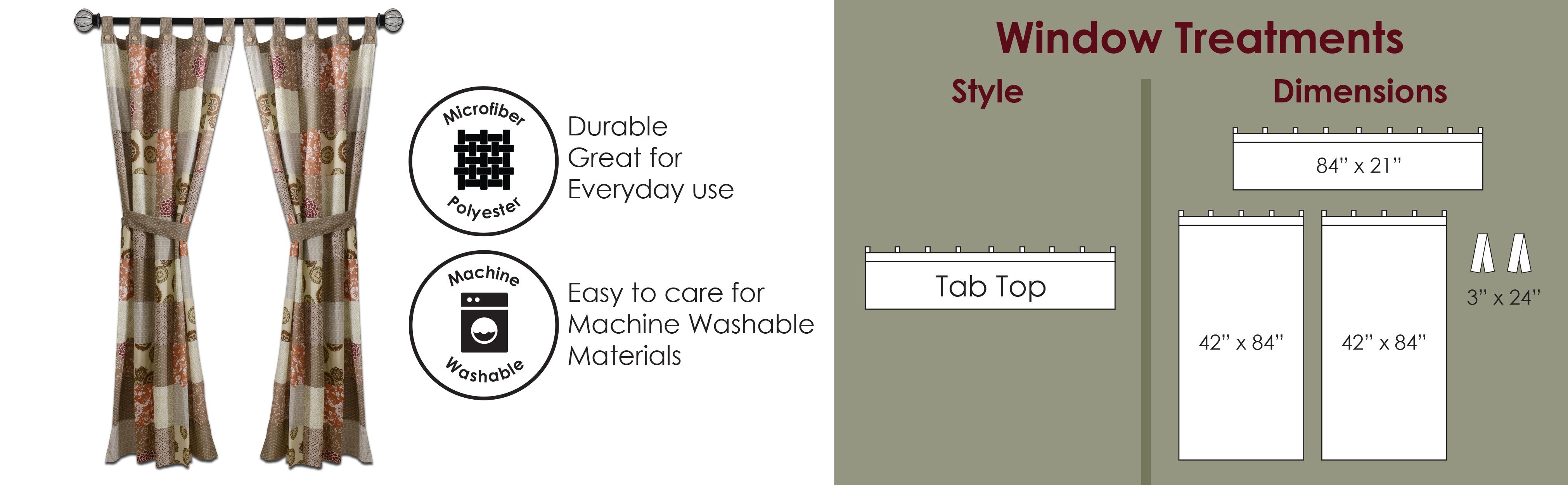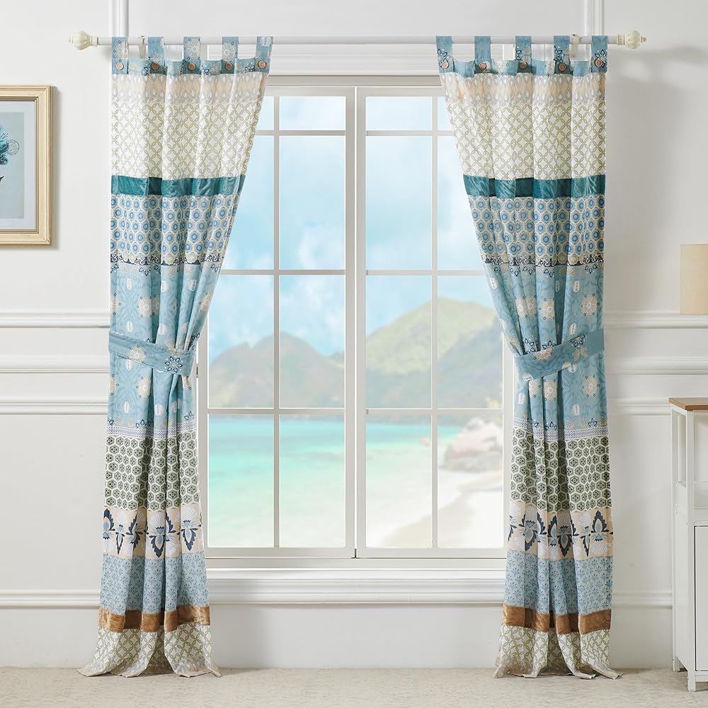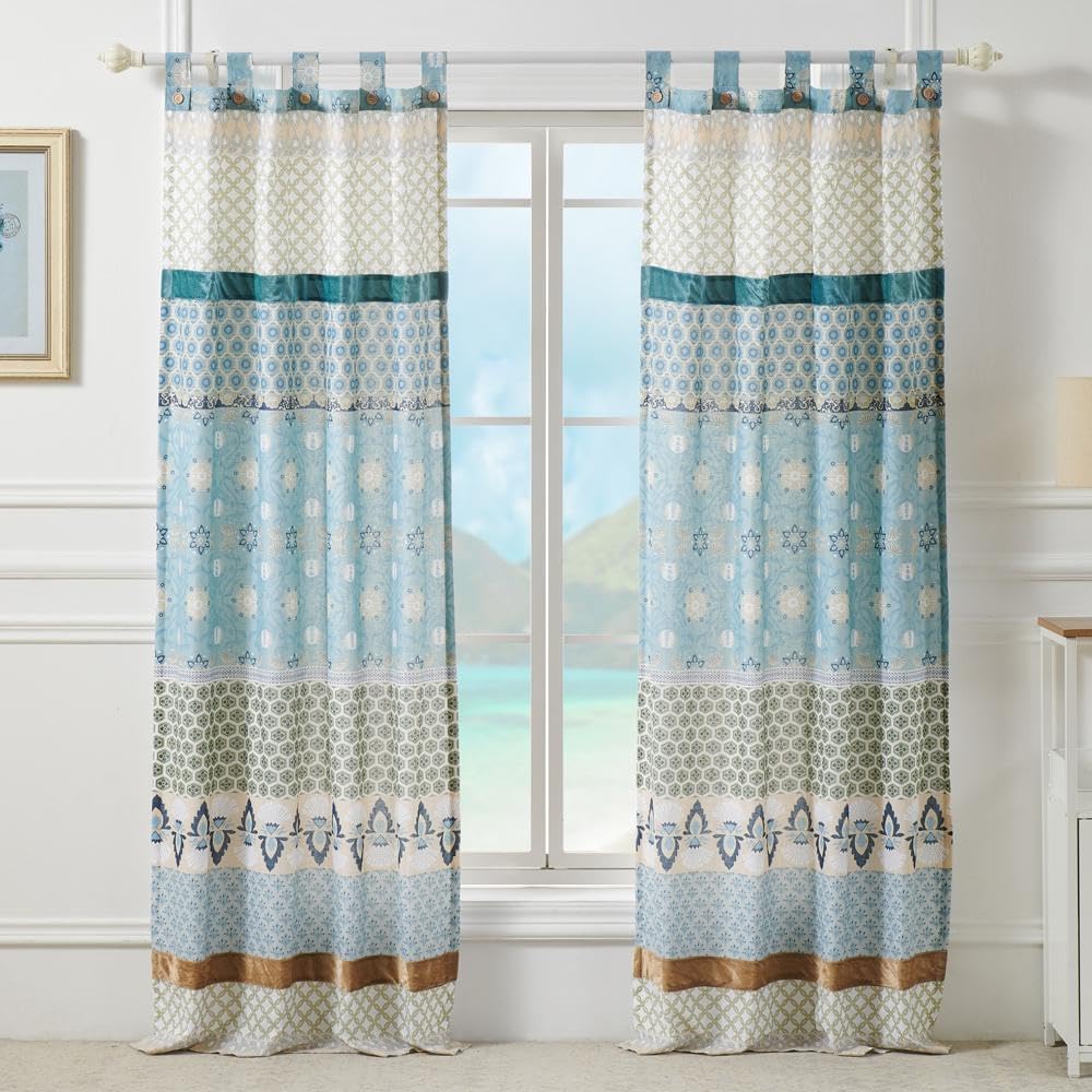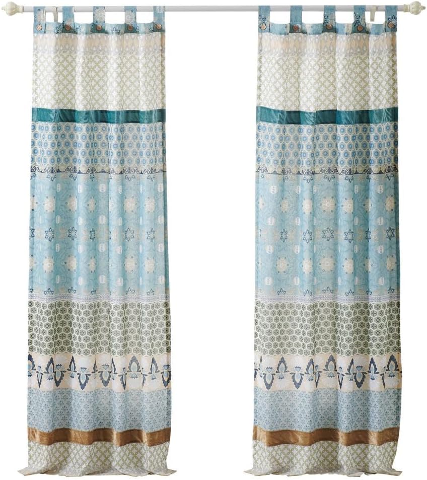 Rows of vivid geometric, foulard and floral prints create distinctive Bohemian styling. The Thalia panel set features the latest fashion colors and multi-fabric construction embellished with velvet bands. This multi-fabric construction panel pair is perfect for any window. 95 Percent cotton, 5 Percent polyester face, 100 Percent cotton back (2 ply). Three-inch tabs along the top fit most curtain rods for hanging. Dimensions: approx. 84 inch long x 42 inch wide each panel, including 3 inch tab top, for total window coverage area of 84 x 84 inches. Machine washable. This 4-piece set includes two panels and two tie backs. Button embellishments on tabs add charm and character.