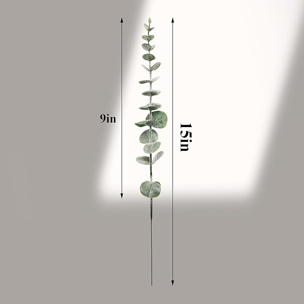 【Sizes of faux eucalyptus stems】 Overall length is about 15 inches/38 centimeters, the branch with leaves is 9 inches long, and there are 25 leaves in total.