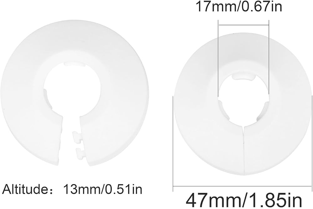 Plumbing wall covers are suitable for pipes with an outer diameter of 20mm/0.78". Inner diameter :21mm / 0.83"; Outer diameter :49mm / 1.9 "; Height :13mm/ 0.51".