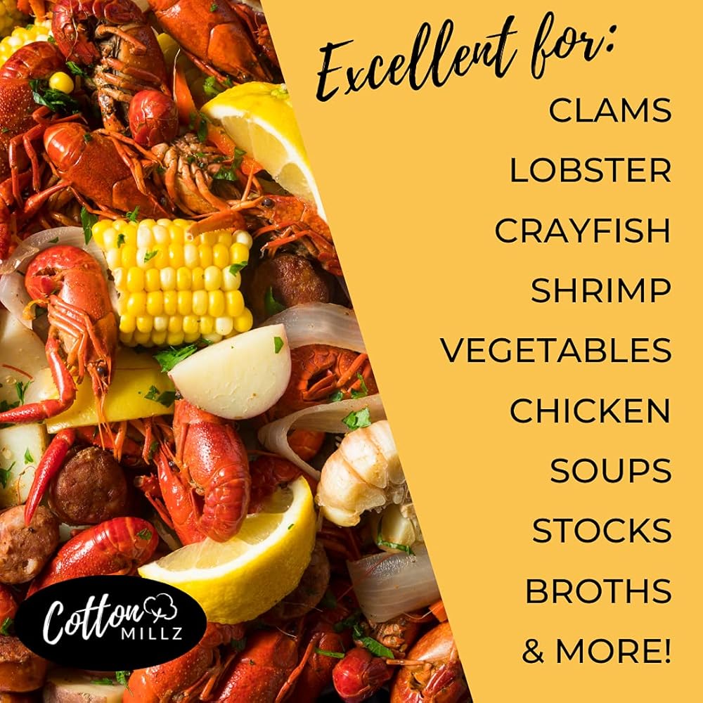 Cotton Millz bags are great for boiling or steaming clams, oysters, crayfish/crawfish, crab, lobster, shrimp, shellfish, and other seafood. Also usable for cooking vegetables like onions, garlic, potatoes, and other produce or use for making soups, stocks, and broths. Use for gathering or foraging produce, mushrooms, or seafood. In addition, these bags are great for washing, drying, and storing vegetables and fruits. From fishing to restaurants and grocery to farmers markets, you have many options. Made in the USA from a cotton-poly blend. Reusable or disposable. Unlike plastic mesh bags, Cotton Millz bags are naturally BPA-free, heat-safe, and food safe. These bags make meal prep and clean up super easy. Our seafood boiling bags are available in 16”, 18”, and 24” lengths on Amazon.