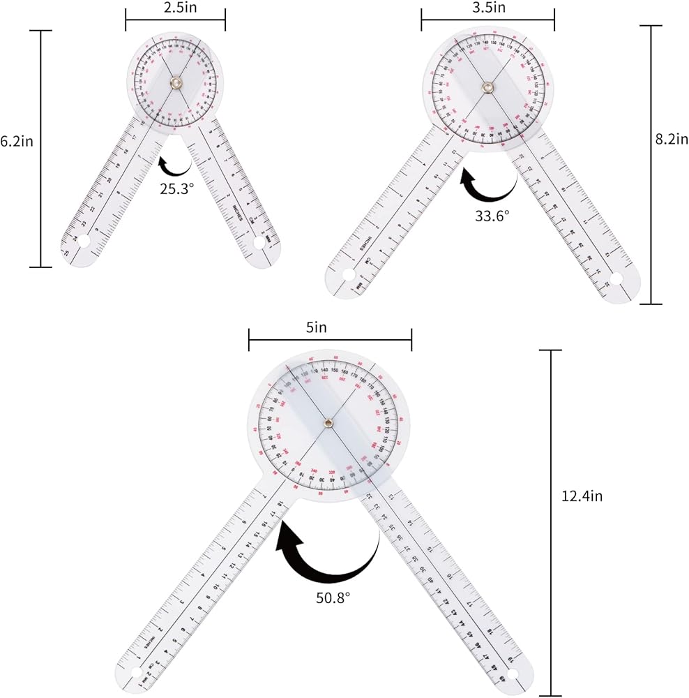 مجموعة مقياس الزوايا 3 قطع 12 بوصة، 8 بوصة، 6 بوصة شريط قياس الجسم - العلاج الطبيعي، العلاج المهني، اللياقة البدنية، أداة قياس مسطرة زاوية المنقلة الطبية