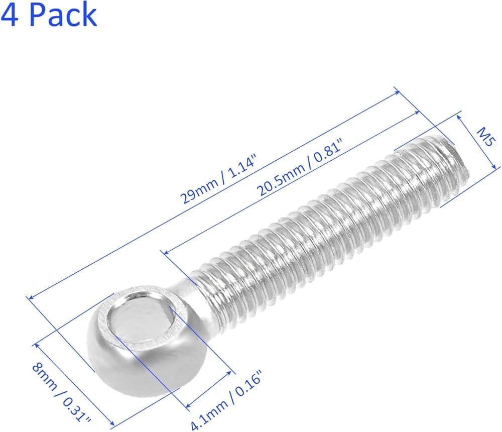 4Pcs Lifting Eye Bolt Rigging. The thread size is M5x20.5mm, the overall length is 29 mm / 1.14 inch, and the pull ring diameter is 8x4.1mm / 0.31x0.16inch (OD*ID).