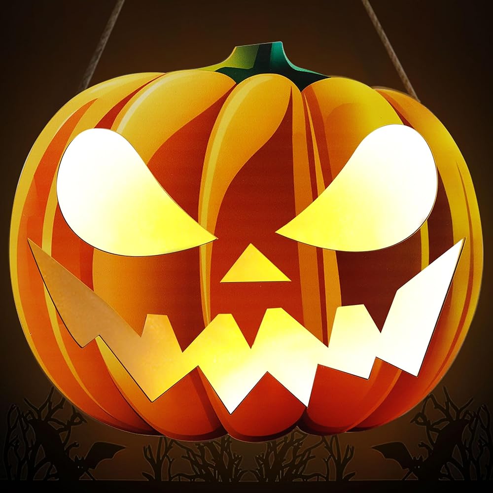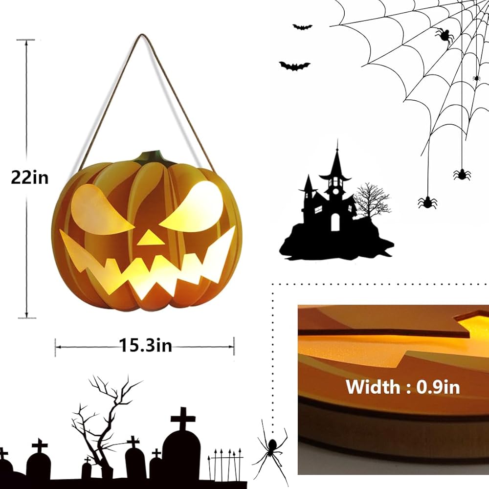 This Halloween pumpkin lantern decoration centers around a lifelike and terrifying pumpkin, with hollowed out eyes, nose, and mouth sparkling, creating a eerie atmosphere. Two AA batteries are required (not included). Easily hang it on the front door or anywhere else. This Halloween outdoor wreath decoration is made of durable solid wood. It comes with a 30 inch thick jute strap that can be adjusted according to your needs, making it easy to hang anywhere and decorate your Halloween party. Very suitable as a front door decoration to welcome Halloween. This type of Halloween decoration is suitable for front doors, indoor and outdoor Halloween decorations, doorways, front yards, walls, windows, fireplaces, gardens, front porches, and trick or treat activities. We will solve any problems you encounter during the shopping process. Wishing you a pleasant shopping experience!