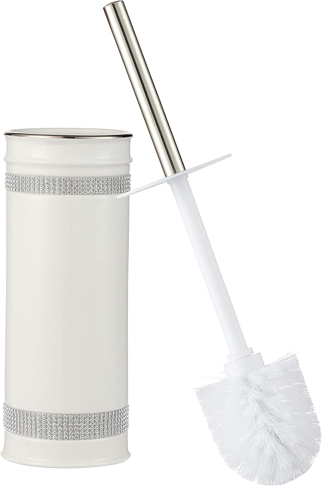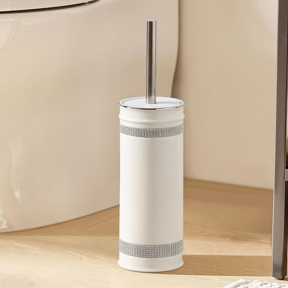 مجموعة فرش المرحاض السيراميكية من إكسسوارات الحمام - فرشاة وحامل المرحاض (أحجار الراين، أبيض)