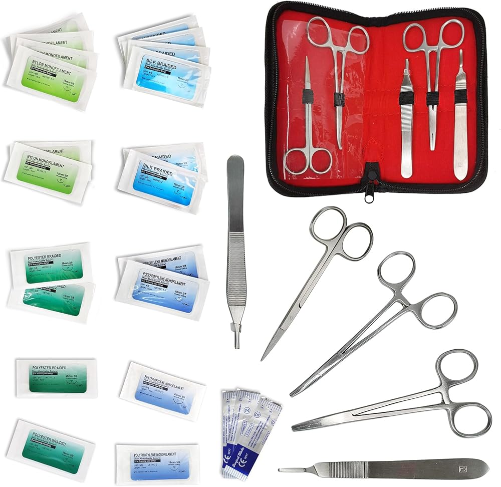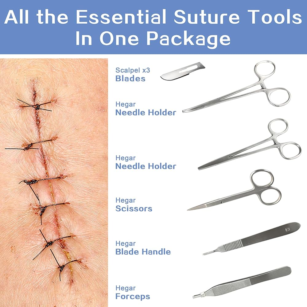 ▲Professional Suture Practice Kit - We provide complete suture tools kit with large variety of suture threads. The kit includes durable human skin-like suture pad (with 14 pre-cut wounds), surgical training scissors, adson forceps (tweezers with teeth), Hegar needle holder, mosquito forceps, scalpel handle*3, blades*10, and 4 types of main non-absorbent sutures (needle & thread). Nylon and Polypropylene monofilament, Silk and Polyester braided.