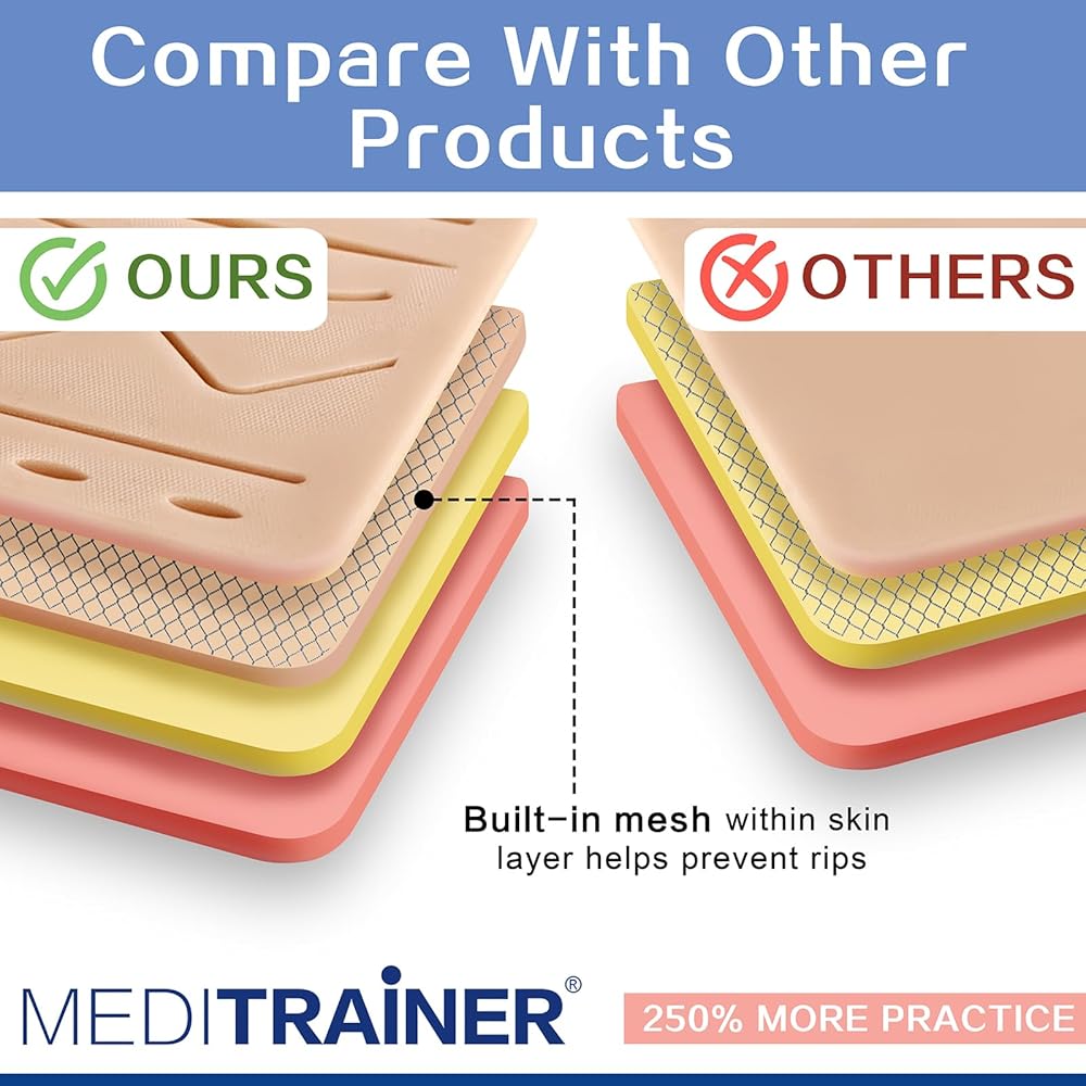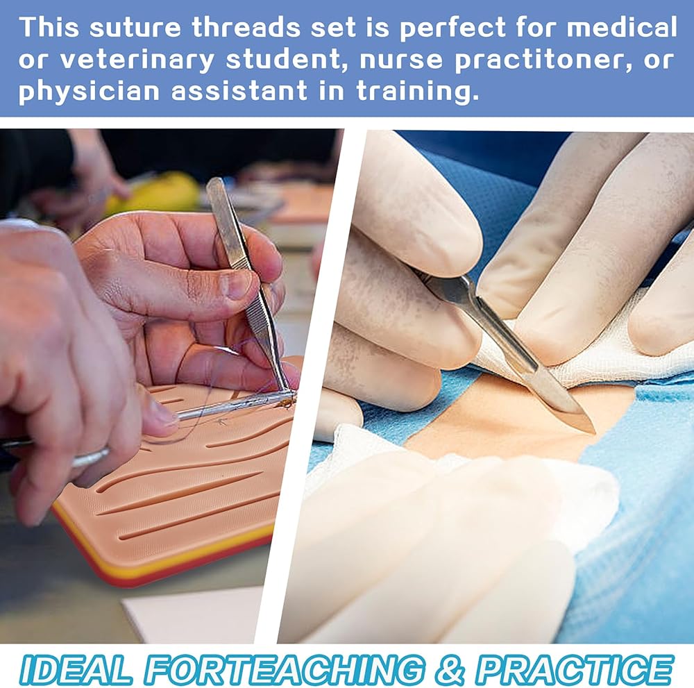 ▲Latest Release & Improved Generation Suture Practice Kit- The new suture pad is made by food grade silicone, non-smell, non-toxic, able to cycle use and portable, this suture practice kit make suture training more easy and happy. The suture pad texture is close to real skin, not just a hard rubber.