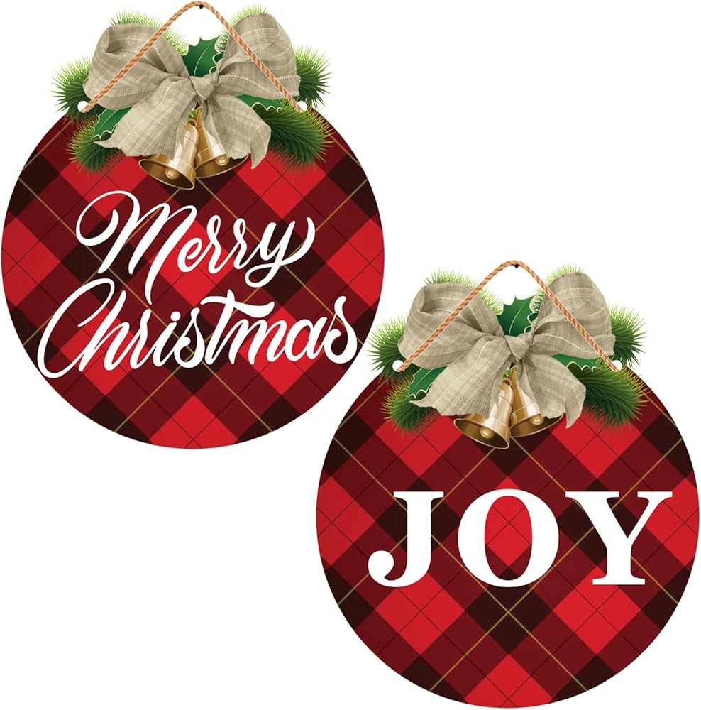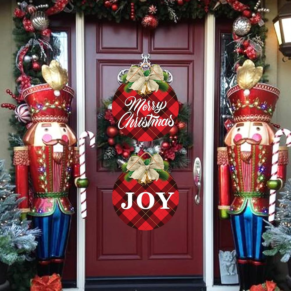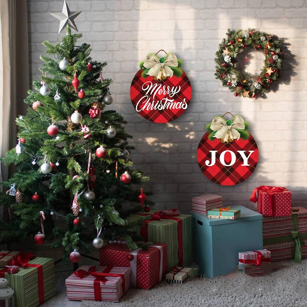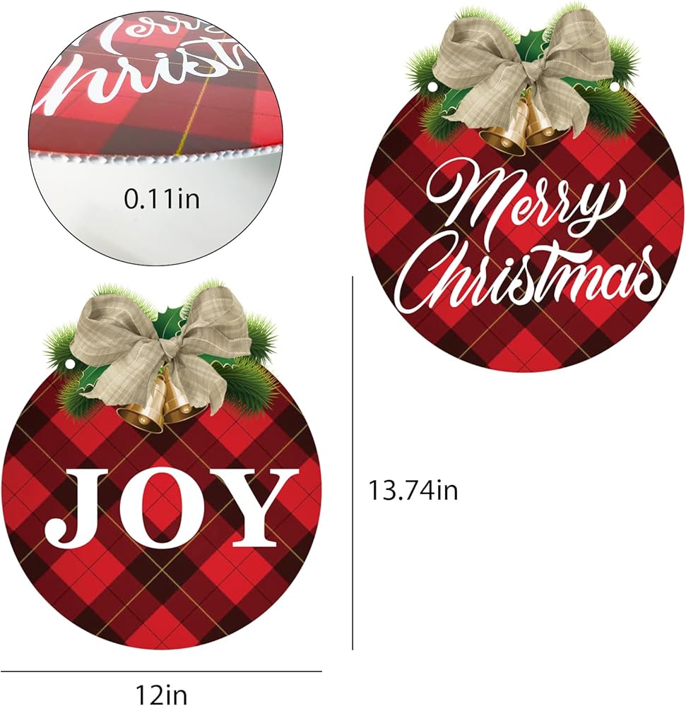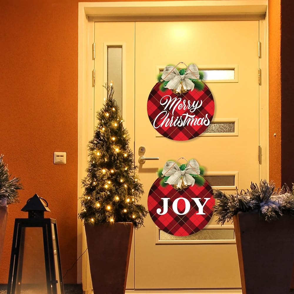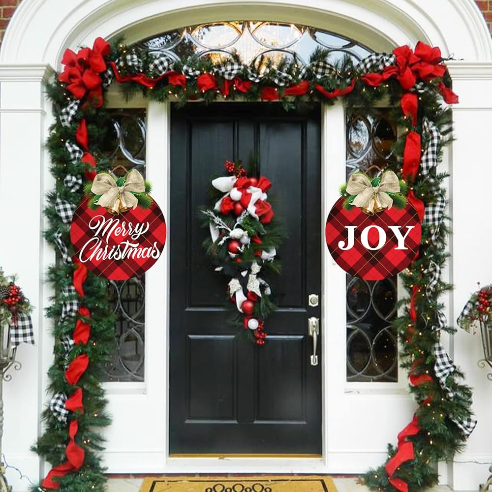 قطعتان من زينة لافتة باب عيد الميلاد - علامة عيد ميلاد سعيد منقوشة بافلو وعلامة الفرح لعطلة ريفية ونافذة باب المزرعة وديكورات داخلية وخارجية
