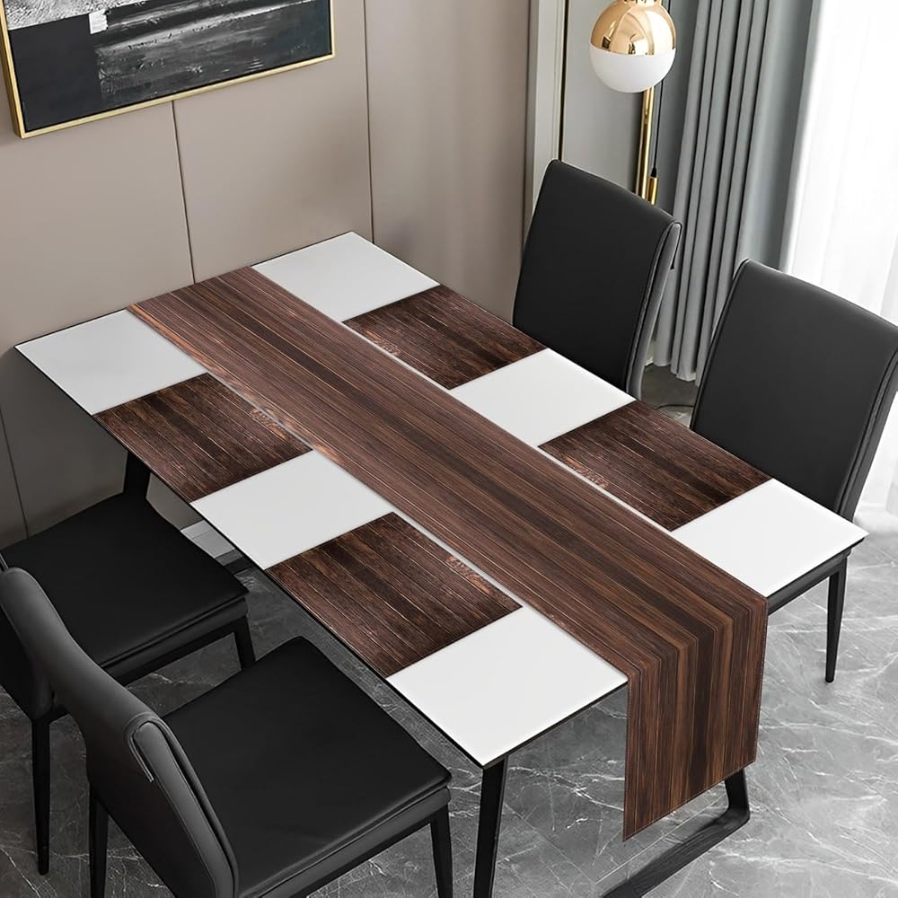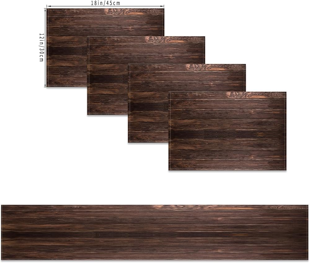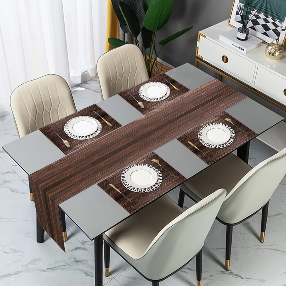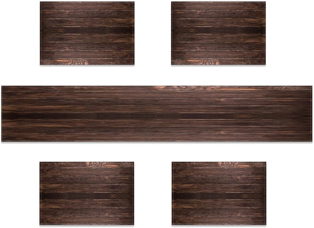 مفرش طاولة ومفارش من الخشب الريفي مكونة من 4 قطع، مفرش طاولة من الخشب البني، مفرش طاولة خشبي قديم لتزيين طاولة الطعام، مفرش طاولة بطول 13 × 72 بوصة و4 مفارش كتان مقاس 18 × 12 بوصة