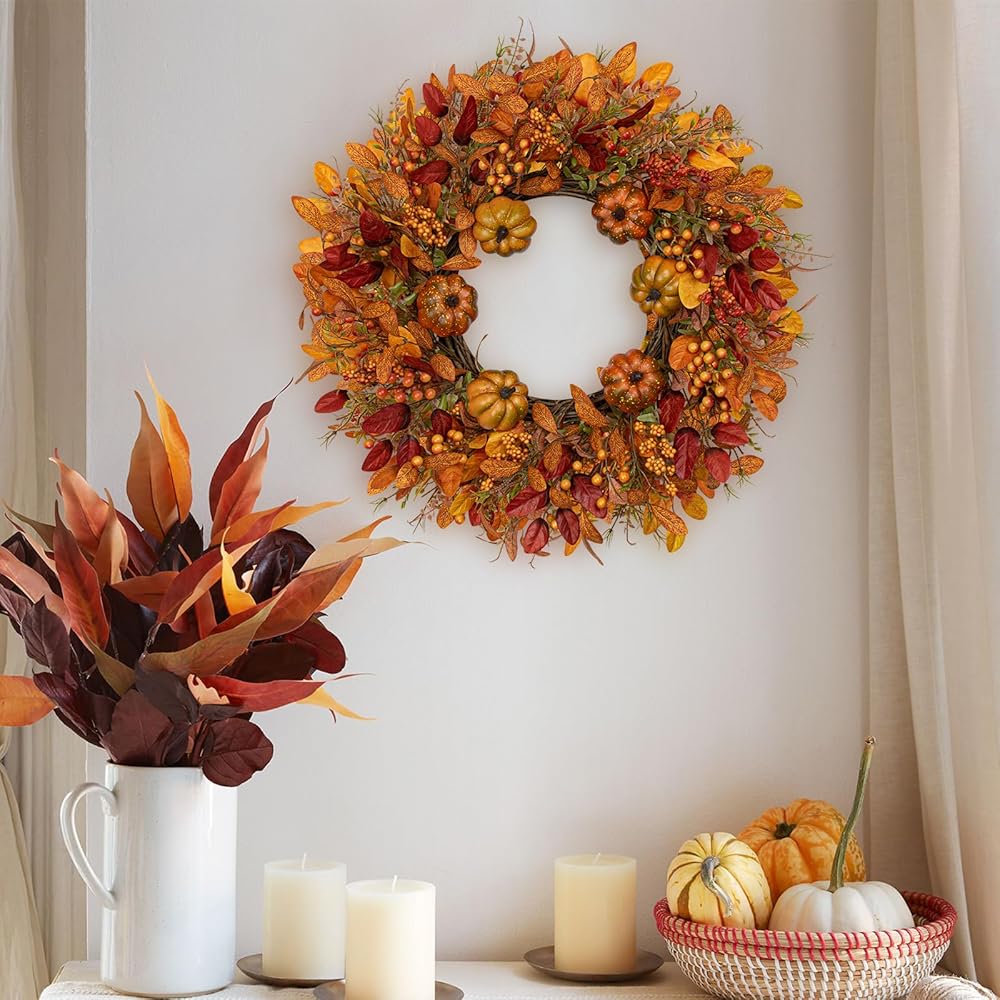 【Artificial Fall Wreath】This pumpkin wreath is handmade of thick fall foliage,clusters of orange berries and 6 fall pumpkins on a sturdy grapevine base.This autumn wreath is not only full and elegant, but also showcasing rich autumn colors and harvest atmosphere, which is very suitable for fall home decor.