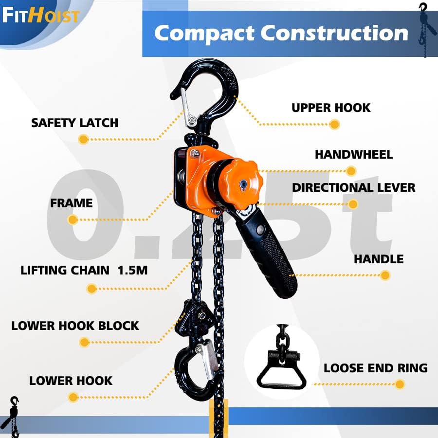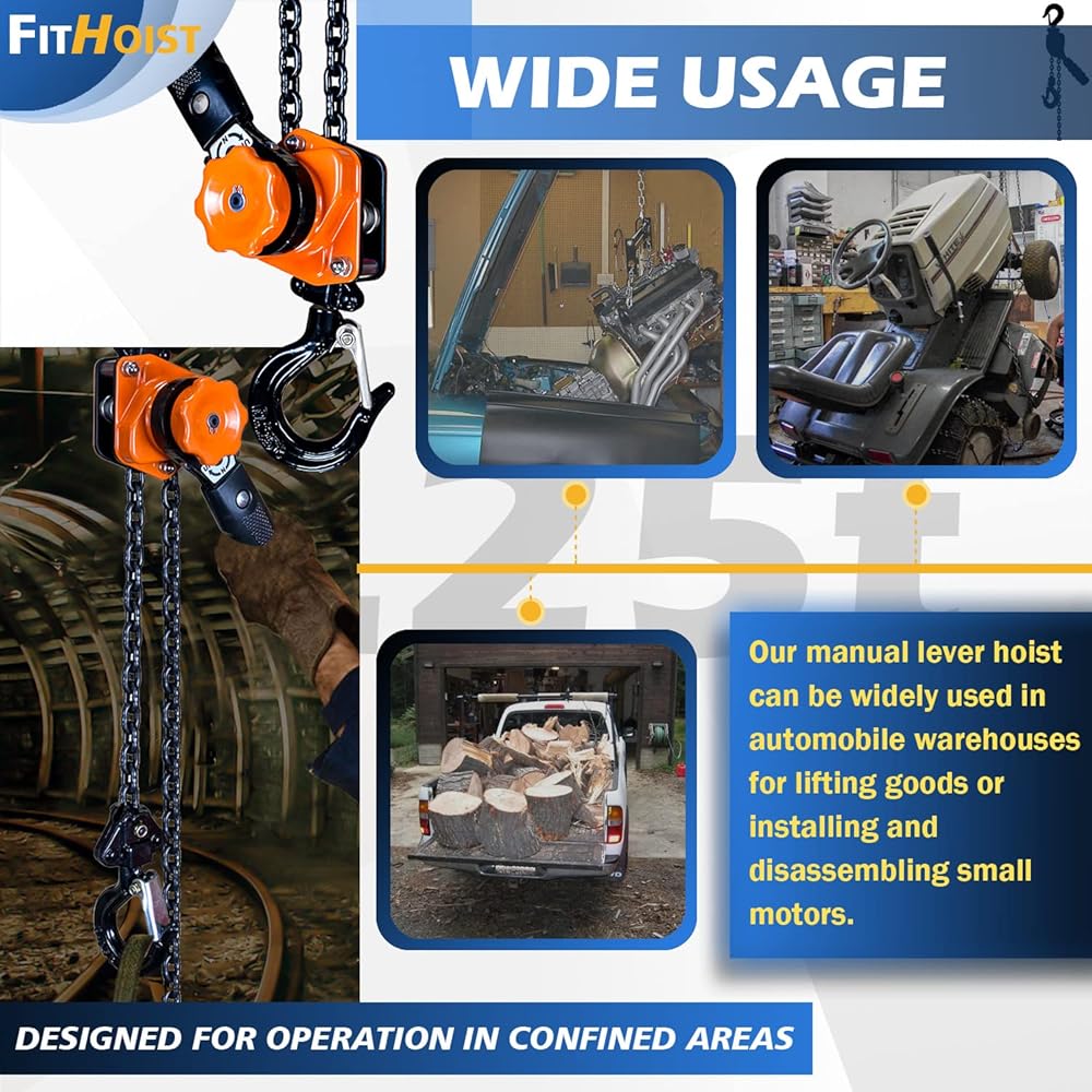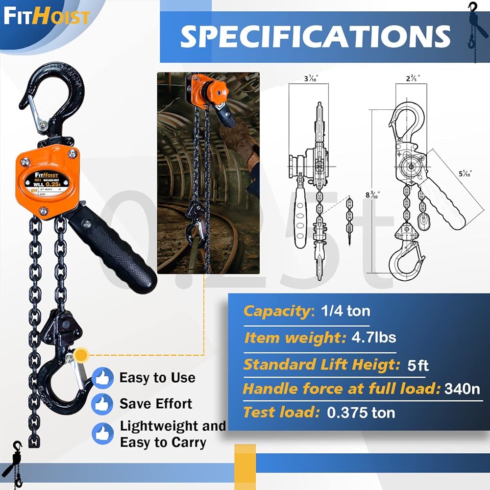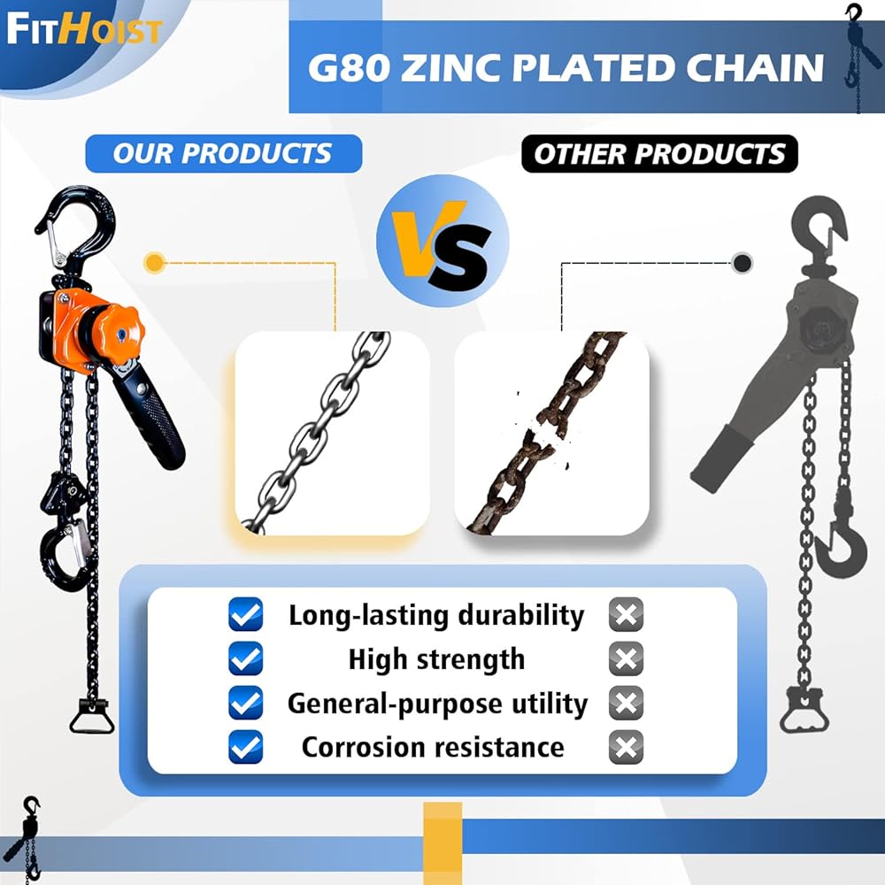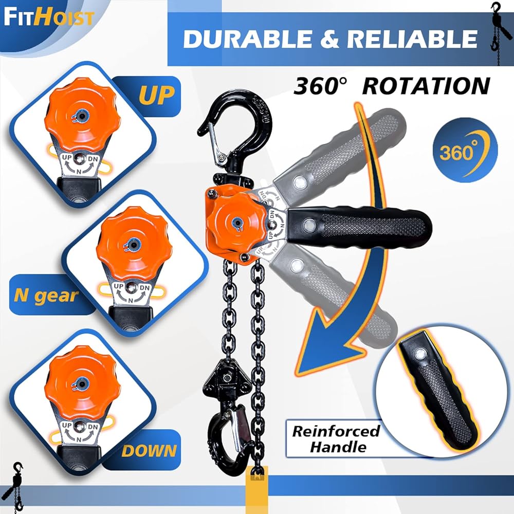 سعة تحميل كبيرة: تأتي هذه الرافعة القوية ذات السلسلة على طول مصاعد ثقيلة تصل إلى 10 أقدام، وسعة تحميل تصل إلى 1/4 طن (550 رطلاً). تتميز سلسلة سبائك المنغنيز G80 بالتوتر والقوة الكافية لتحميل الأشياء الثقيلة.