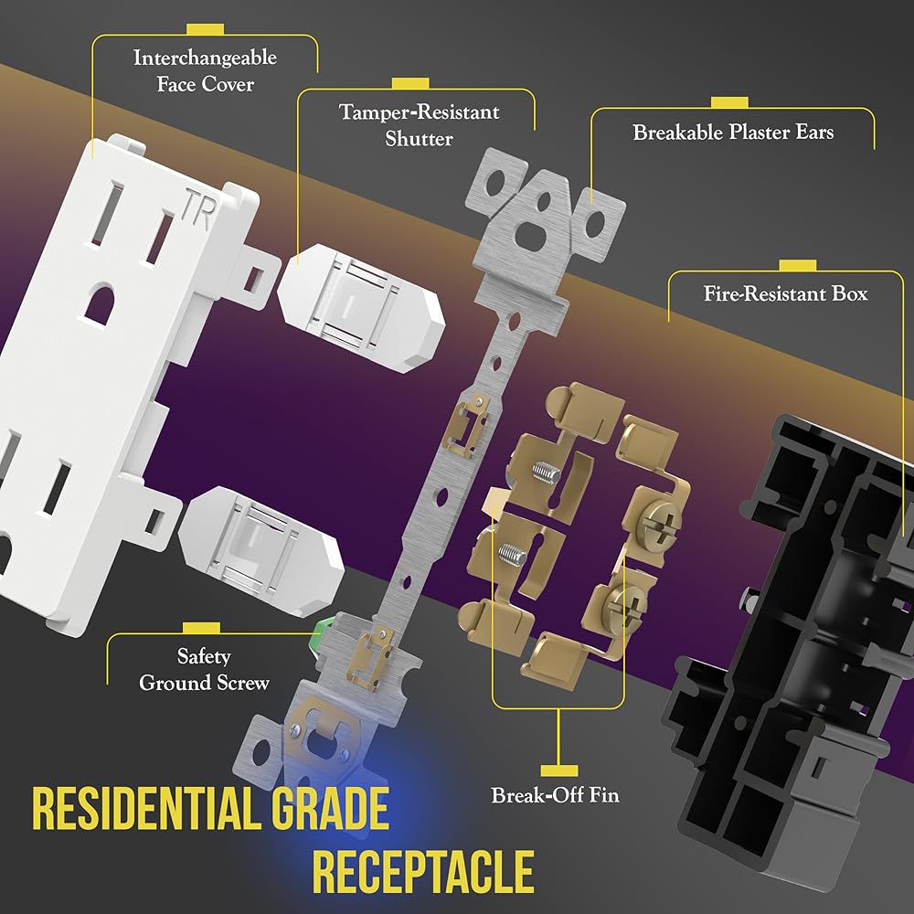 تركيب سهل مع التعليمات المتضمنة. يتوافق مع المادة 406.12 من NEC لعام 2017 فيما يتعلق بالأوعية المقاومة للتلاعب. 15 أمبير 125 فولت، 5-15 آر، مؤرض ذاتيًا، 2 قطب، 3 أسلاك. UL94، تصنيف V2، ضمان لمدة عام، مدرج في قائمة UL