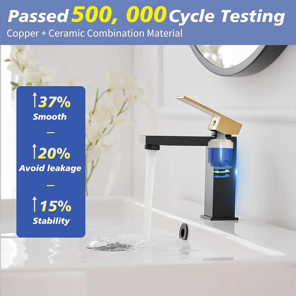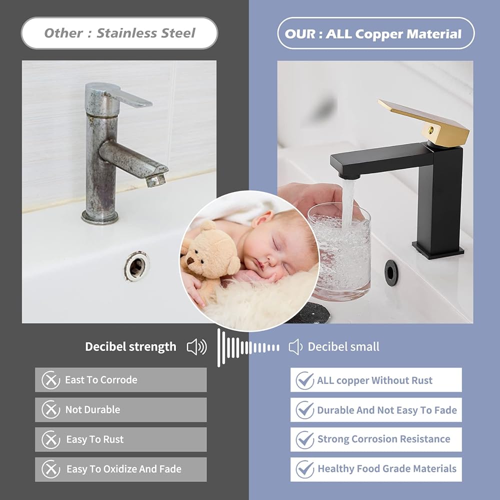 جسم صنبور الحمام مصنوع من النحاس الصلب الخالي من الرصاص، مما يضمن الجودة وطول العمر. مقاومة الخدوش. لا تمنع المادة التشوه والصدأ فحسب، بل تحافظ أيضًا على سلامتك أنت وعائلتك من المواد الكيميائية الضارة. خرطوشة سيراميك عالية الغلق، تتمتع بأداء خالٍ من التنقيط.