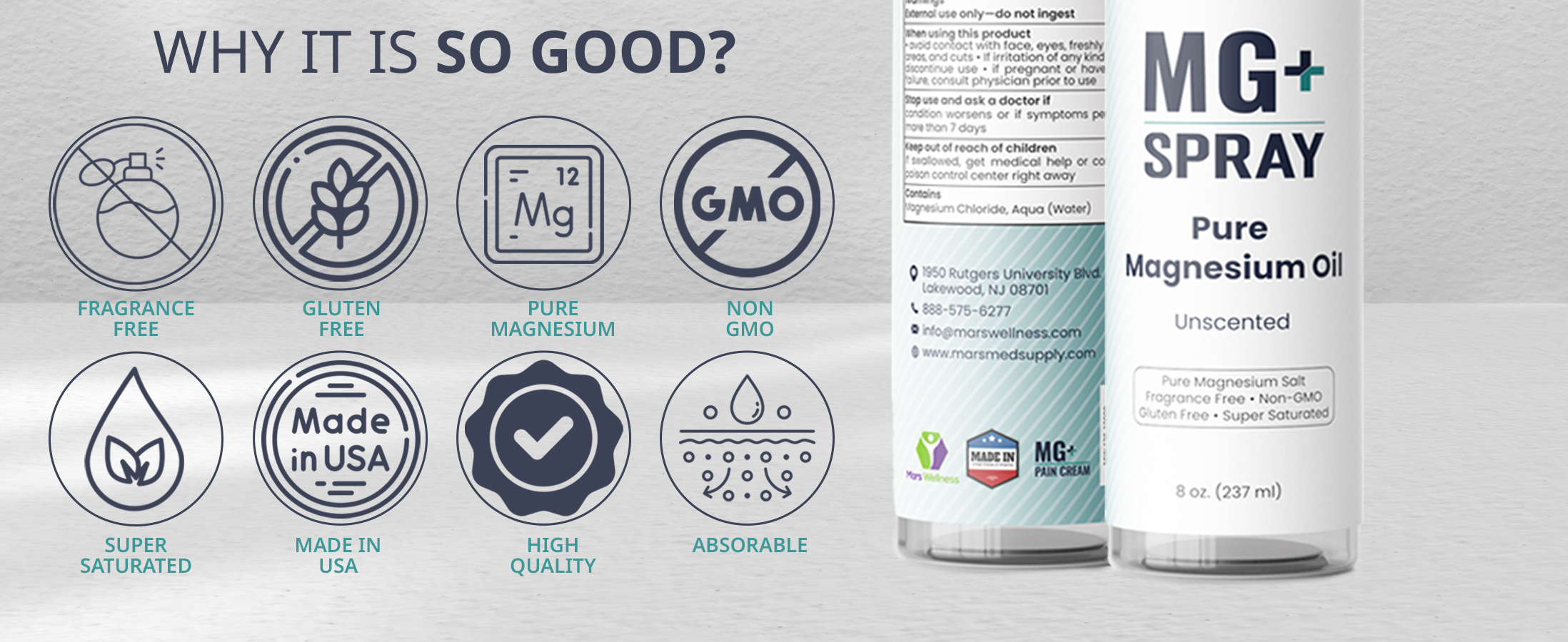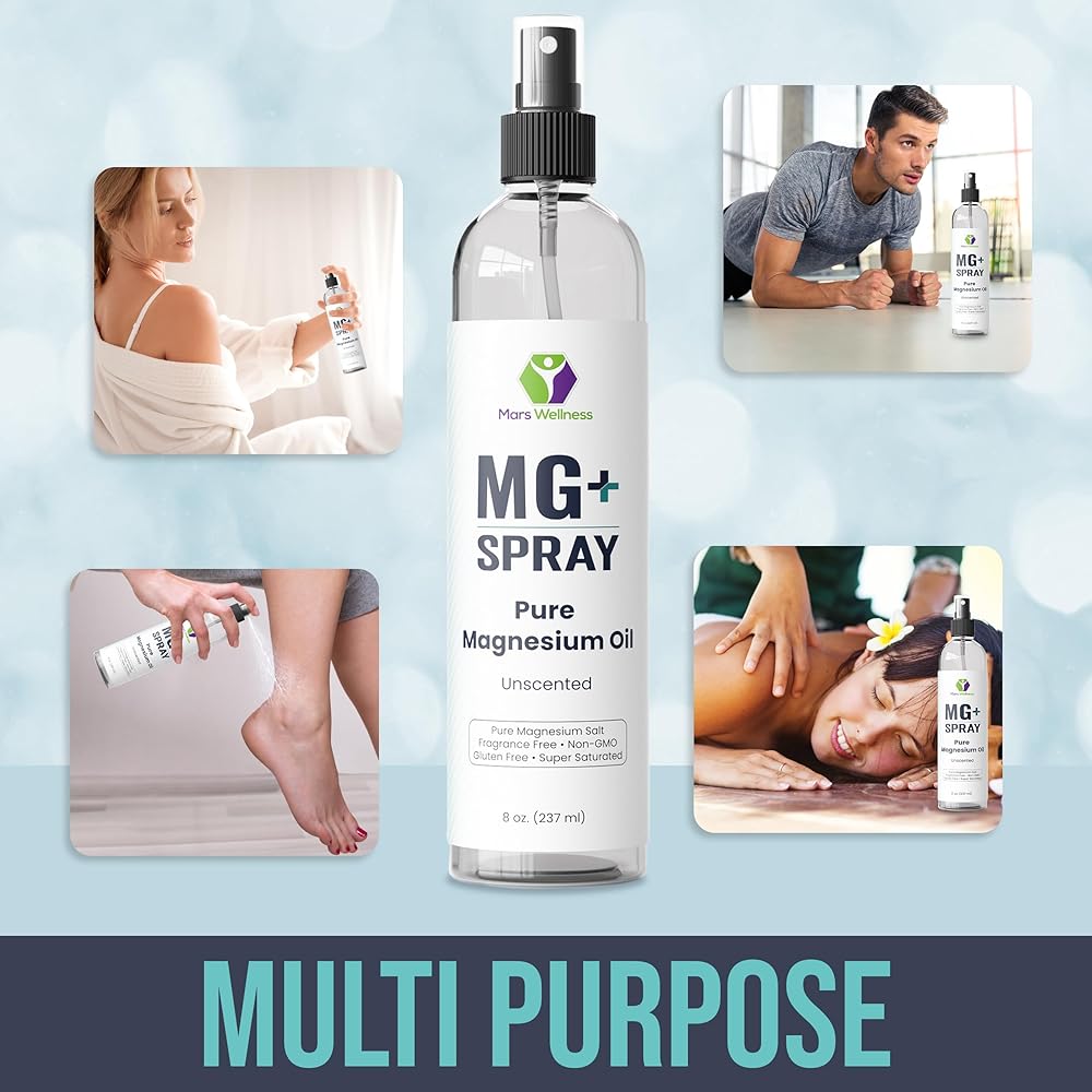 Mars Wellness MG+ بخاخ زيت المغنيسيوم النقي - 8 أونصة رذاذ مغنيسيوم موضعي للاسترخاء وتجديد شباب العضلات، صنع في الولايات المتحدة الأمريكية - تعقيم المغنيسيوم