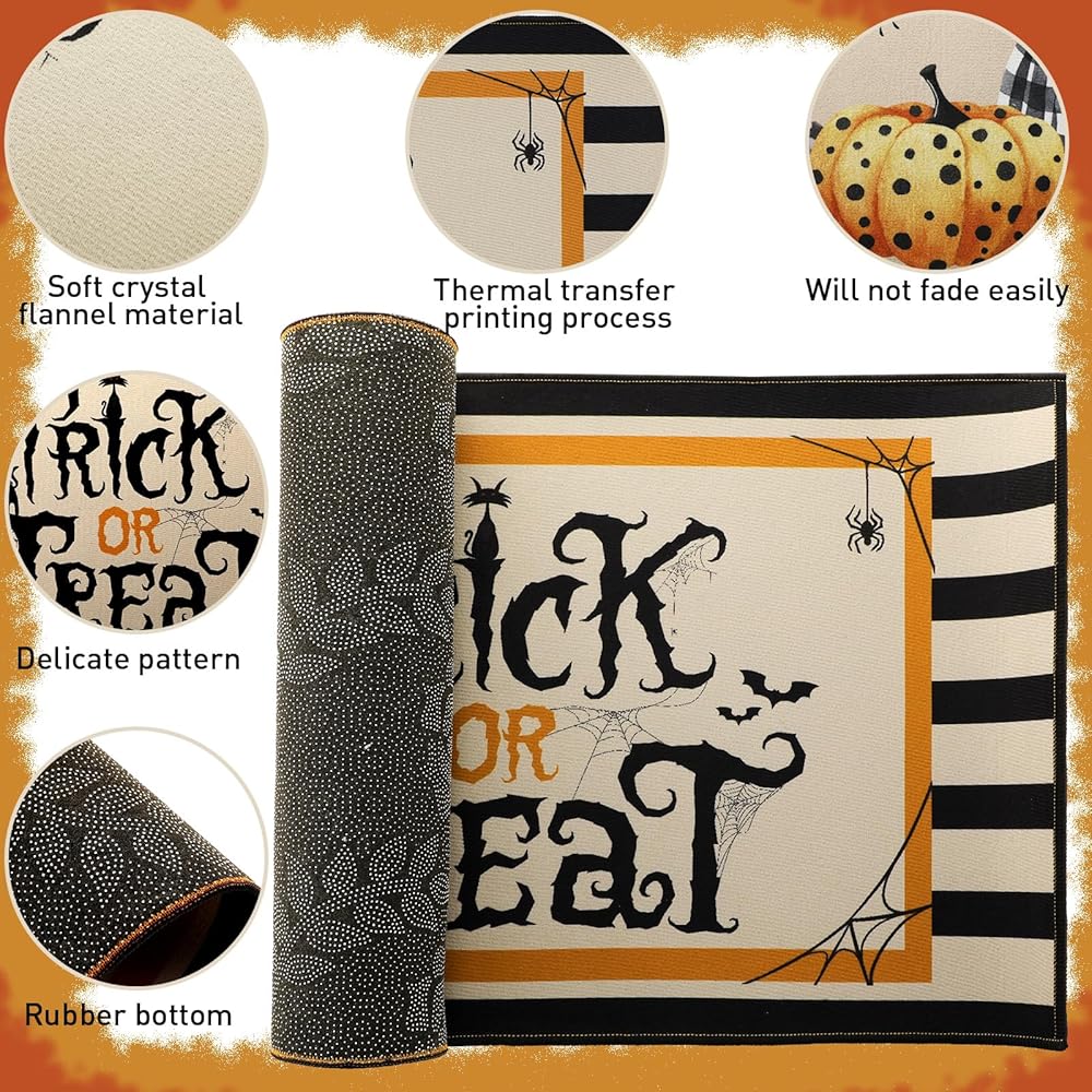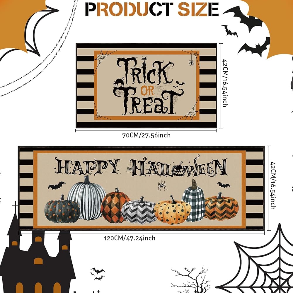 مجموعات سجادة الهالوين: تحتوي هذه العبوة على قطعتين من سجاد الهالوين، بقياس تقريبًا. 47 × 16.5 بوصة / 120 × 42 سم، 27 × 16.5 بوصة / 70 × 42 سم، مناسبة للمطابخ وديكورات المدخل، مما يسمح لك بإضافة لمسة الهالوين