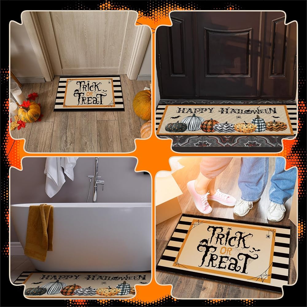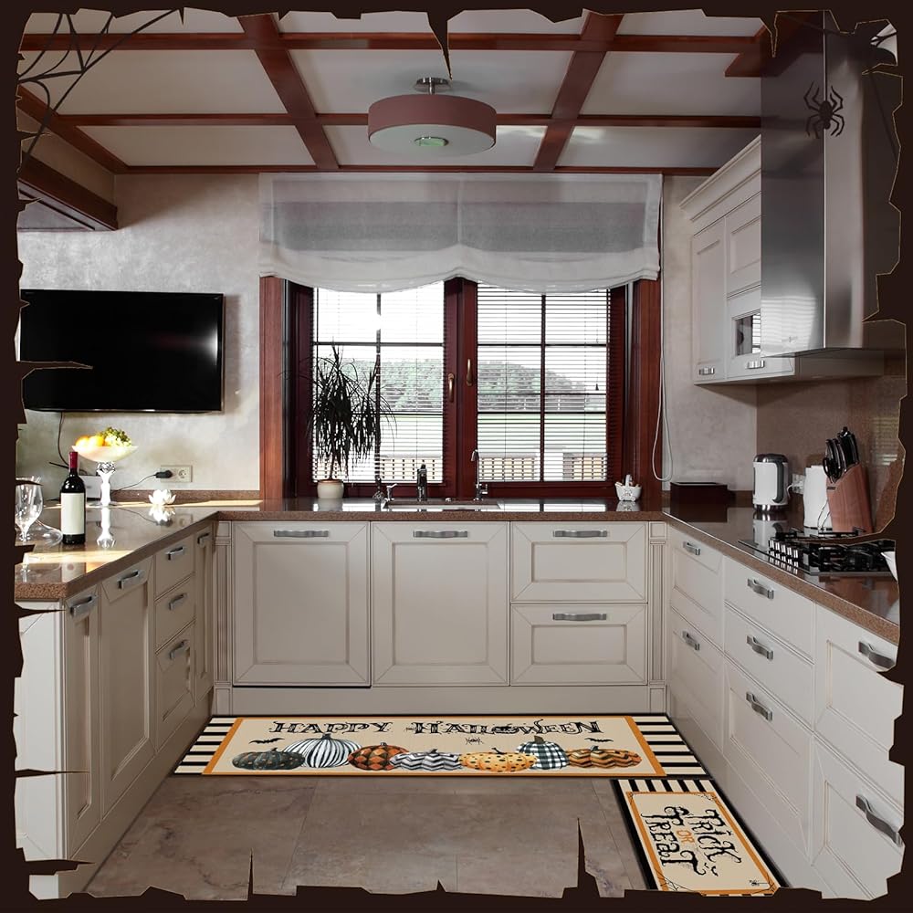 مجموعة سجاد مطبخ Timgle Halloween مكونة من 2 سجادة مطبخ مزخرفة خدعة أو علاج سجادة حمام الهالوين سجادة أرضية موسمية على شكل يقطين للحمام الداخلي والخارجي، 27 × 16.5 بوصة، 47 × 16.5 بوصة