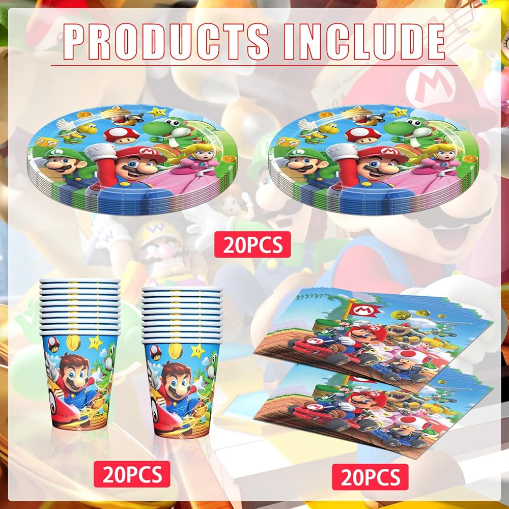 60 قطعة من مجموعات أدوات مائدة ماريو، تتضمن لوازم حفلات أعياد ميلاد ماريو 20 قطعة من الأطباق الورقية مقاس 9 بوصات، و20 قطعة منديل، و20 قطعة من الأكواب الورقية لديكورات حفلات ماريو
