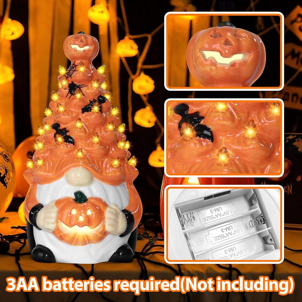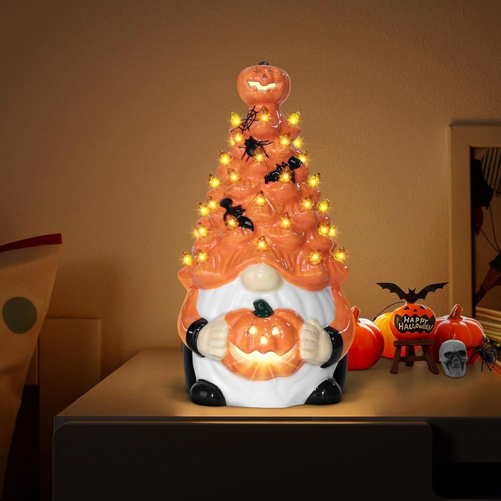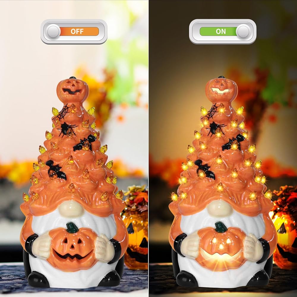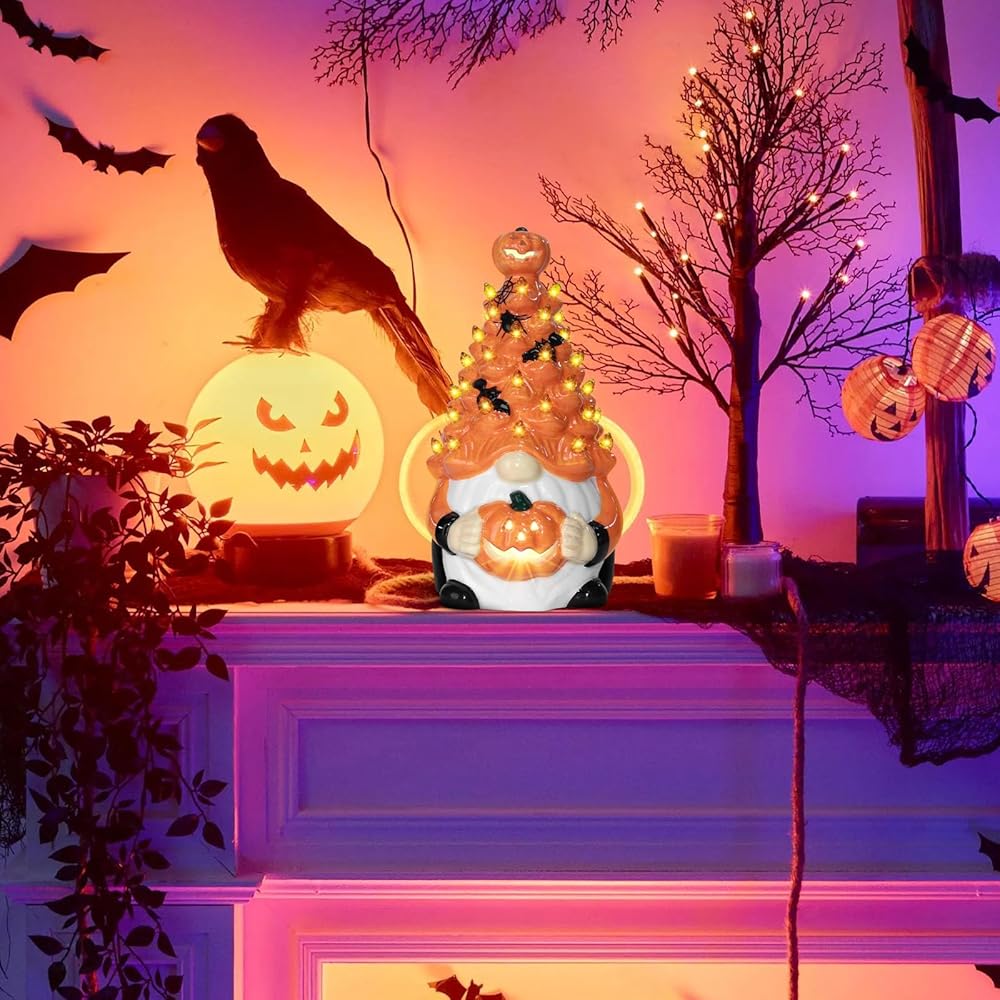 Pre-Lit Illumination: Each ceramic pumpkin gnome comes equipped with warm lighting, providing a soft glow that creates ambiance for your indoor space, making them perfect as Halloween tabletop centerpieces or mantelpiece accents