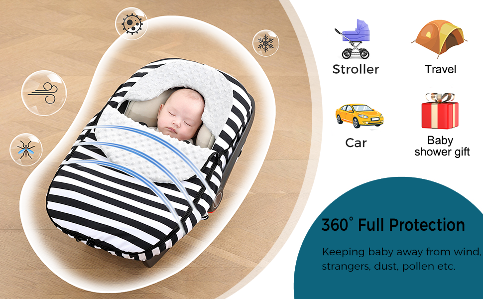 • 【سفر مريح】غطاء مقعد سيارة شتوي ملفوف حول مقعد سيارة الطفل أو عربة أطفال ذات حجم قياسي للحفاظ على دفء الطفل أثناء السفر في الطقس البارد.