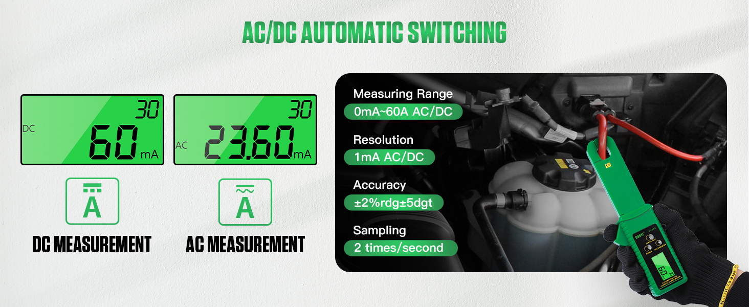 1. 【التبديل التلقائي للتيار المتردد/تيار مستمر والتصفير بنقرة واحدة】يستخدم مقياس المشبك الرقمي أحدث تقنيات التكامل الرقمي لتحديد إشارات التيار المتردد والتيار المستمر تلقائيًا دون التبديل اليدوي. يتميز جهاز قياس المشبك المتعدد أيضًا بمزايا قياس عدم الاتصال من نوع المشبك، والدقة العالية، والقدرة القوية على مقاومة التداخل. نطاق القياس: 0mA~60A، الدقة: 1mA، الدقة: ±2%rdg±5dgt. قبل القياس، يرجى الضغط على زر "صفر" لإجراء تعديل تلقائي للصفر.