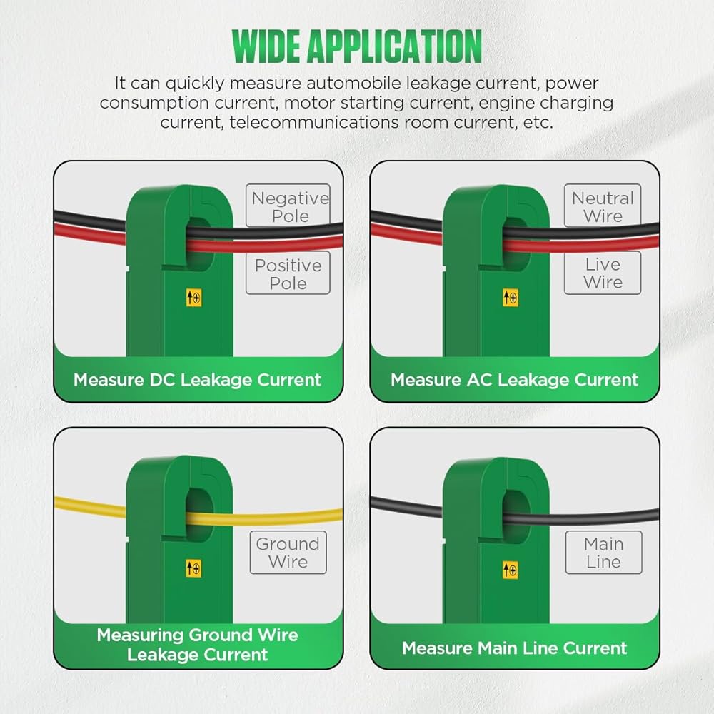5. 【تطبيق واسع 】 يستخدم هذا التيار المتناوب تيار مستمر تسرب التيار المشبك متر على نطاق واسع في صناعة صيانة واختبار السيارات والصناعات المتعلقة بصيانة الطاقة. يمكن لمقياس المشبك الرقمي أن يقيس بسرعة تيار تسرب السيارات، وتيار الاستهلاك، وتيار بدء تشغيل المحرك، وتيار شحن المحرك، وما إلى ذلك. ويمكنه أيضًا الكشف بسرعة عن تيار غرفة الاتصالات، وتيار تسرب الأسلاك المتشققة، وتيار التسرب الكهربائي، وما إلى ذلك.