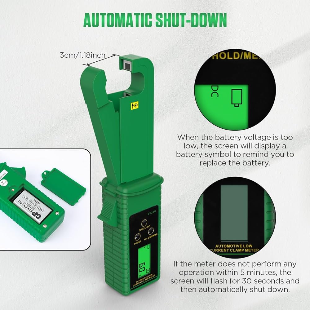4. 【تعمل بالبطارية وبطارية منخفضة سريعة وإيقاف التشغيل التلقائي】يتم تشغيل جهاز قياس المشبك المتعدد ببطارية 9 فولت (متضمنة في العبوة). عندما يكون جهد البطارية منخفضًا جدًا، ستعرض الشاشة رمز البطارية لتذكيرك باستبدال البطارية. إذا لم يتم التشغيل لمدة 5 دقائق بعد تشغيل مقياس أمبير التيار المتردد/المستمر، فستومض شاشة LCD. إذا قمت بالضغط على زر "الطاقة"، فسيكون الاختبار طبيعيًا. وإلا، فسيتم إيقاف تشغيله تلقائيًا بعد الوميض لمدة 30 ثانية.