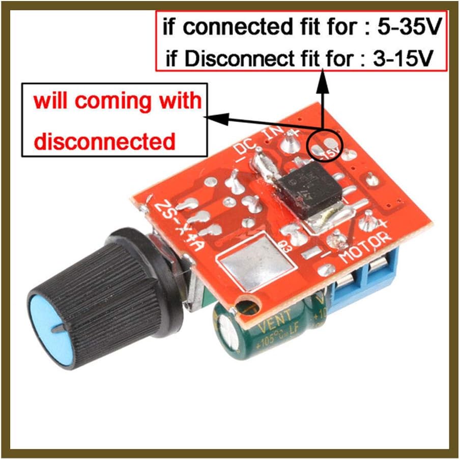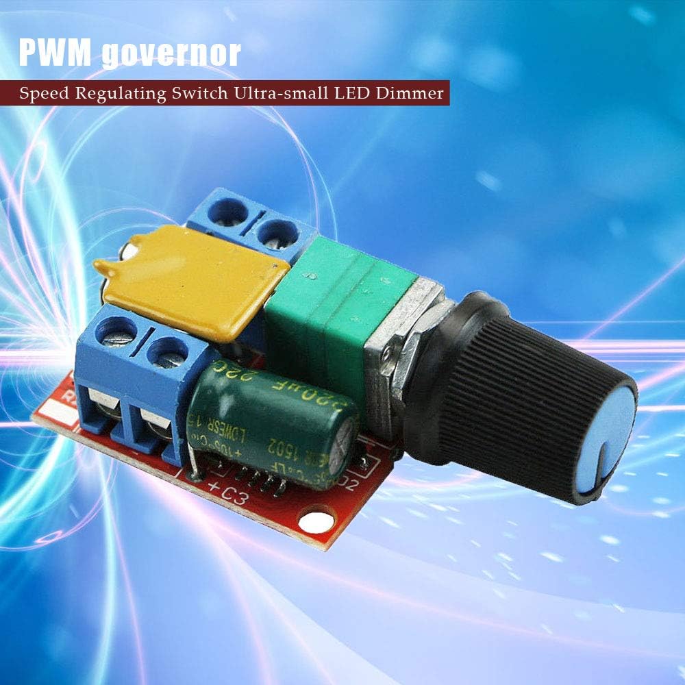 Mini wide voltage DC motor governor adopts the latest low voltage drive technology, the current is up to 5A, the maximum voltage is 3-35V (3-9V input needs short circuit), and it is equipped with self-recovery fuse, stable performance, also suitable for LED Dimming.